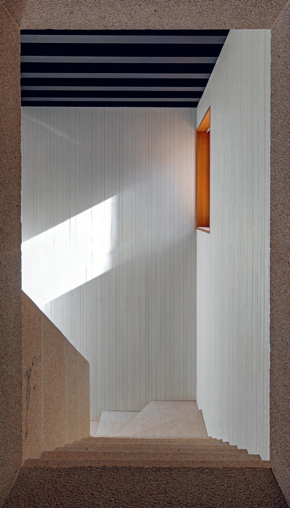 The new volume shows the contrast between the city and the small community through the expression of its facades – a masonry wall with practically no openings towards the street in opposition to the perforated interior elevation –, blending in with the historic buildings surrounding it. As in the old wing all the halls are different, the extension building follows this approach and the rooms vary in proportion, form, and light atmosphere to adapt to the new needs of the exhibition venue. The rooms overlook each other to create a continuous circulation route where the thick thresholds organize the space.