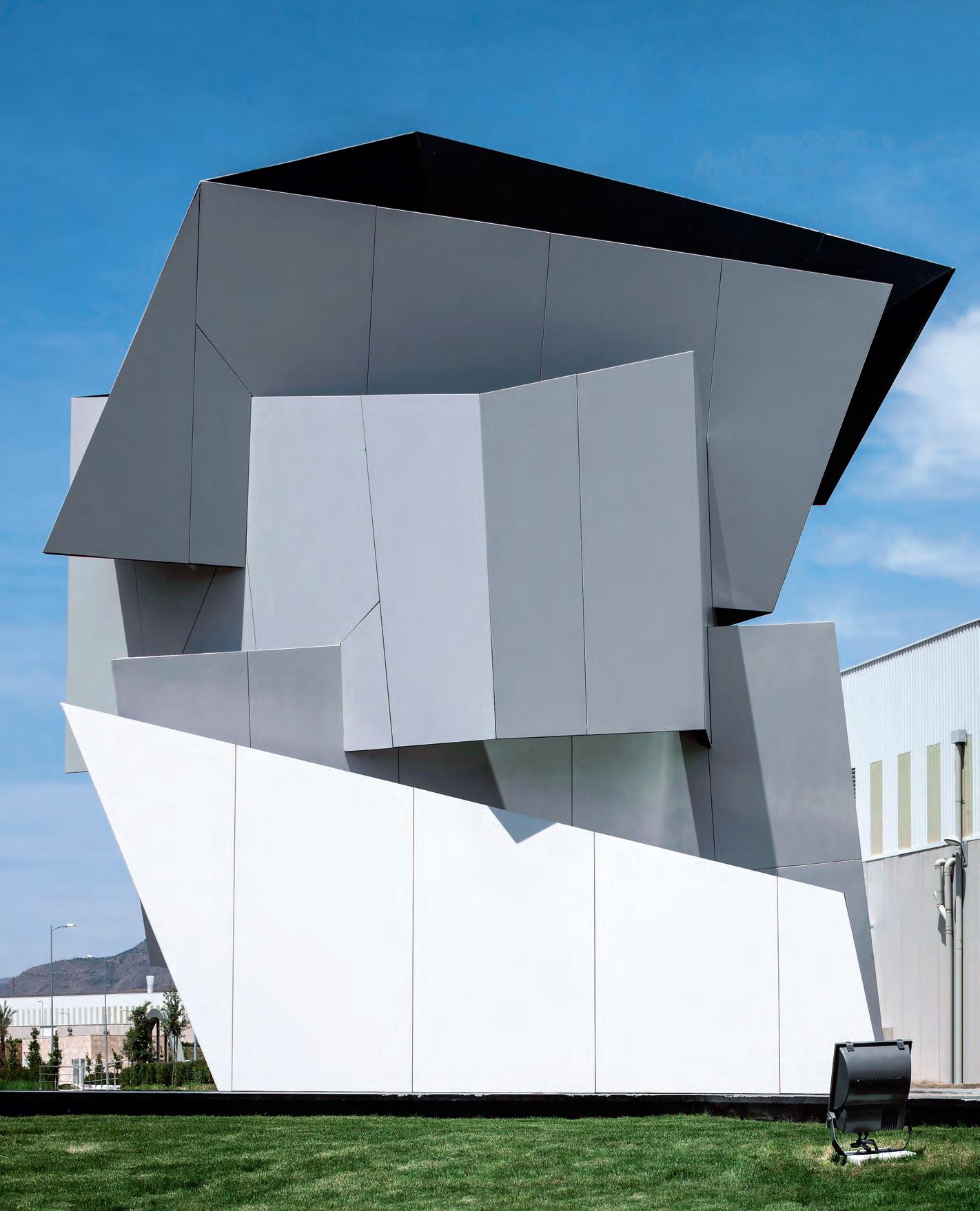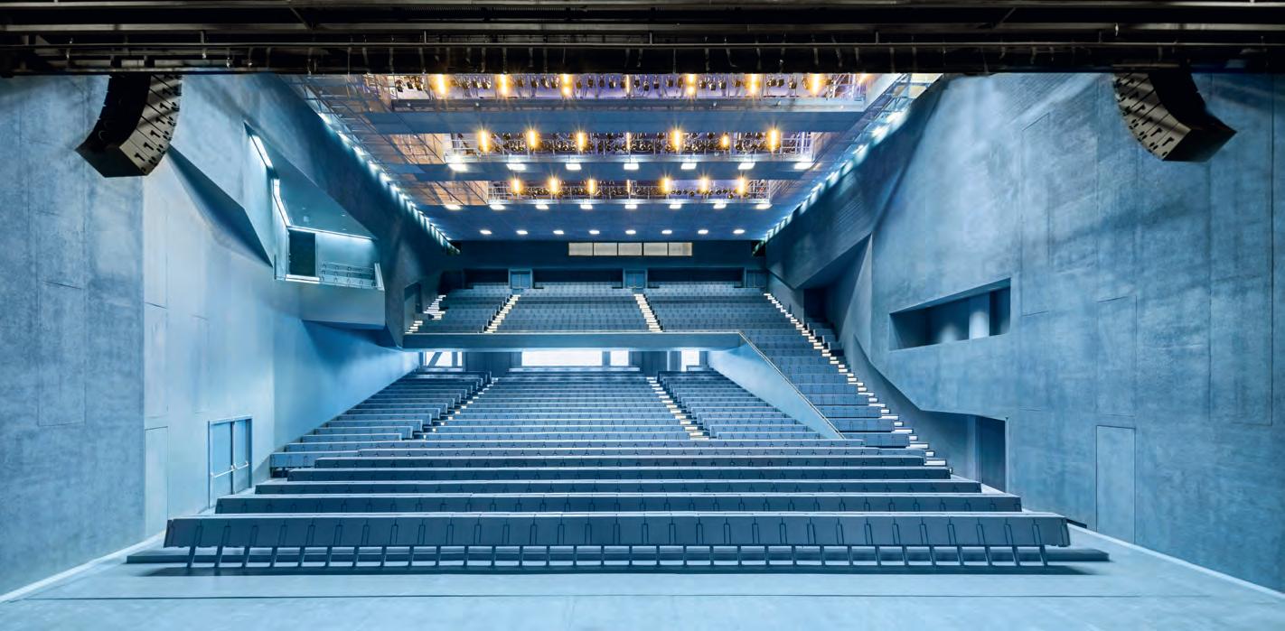 The three auditoriums stick out of different sides of a central cube, and function either separately or in any of different combinations, in accordance with the requirements of the performances on show.
