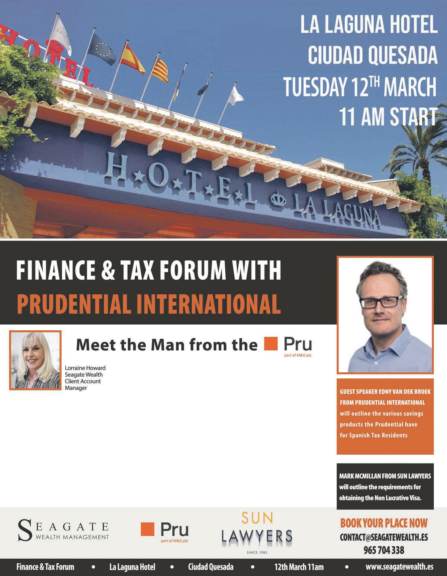 For the opportunity to nd out more about Prudential and Sun Lawyers, register to come along to the event and talk to “the man from the Pru”. Simply call 965 704 338 or email: Contact@ SeagateWealth.es to reserve your place.