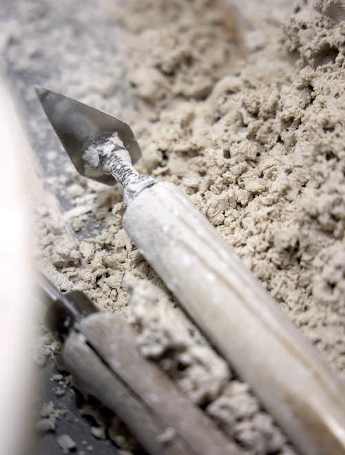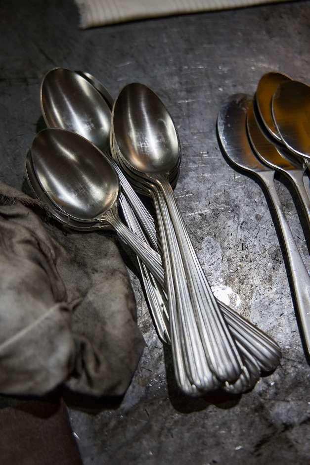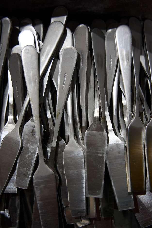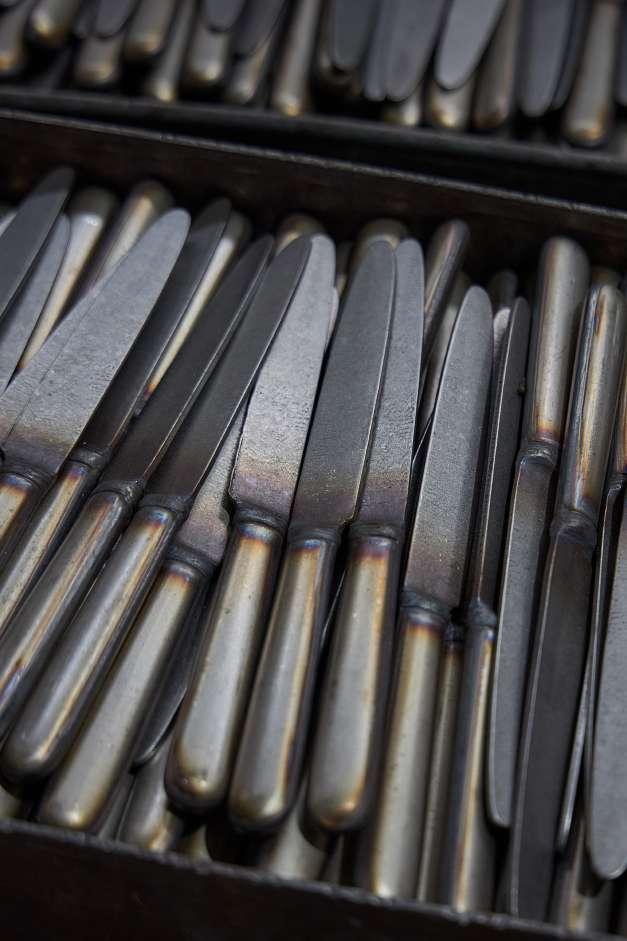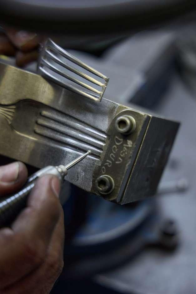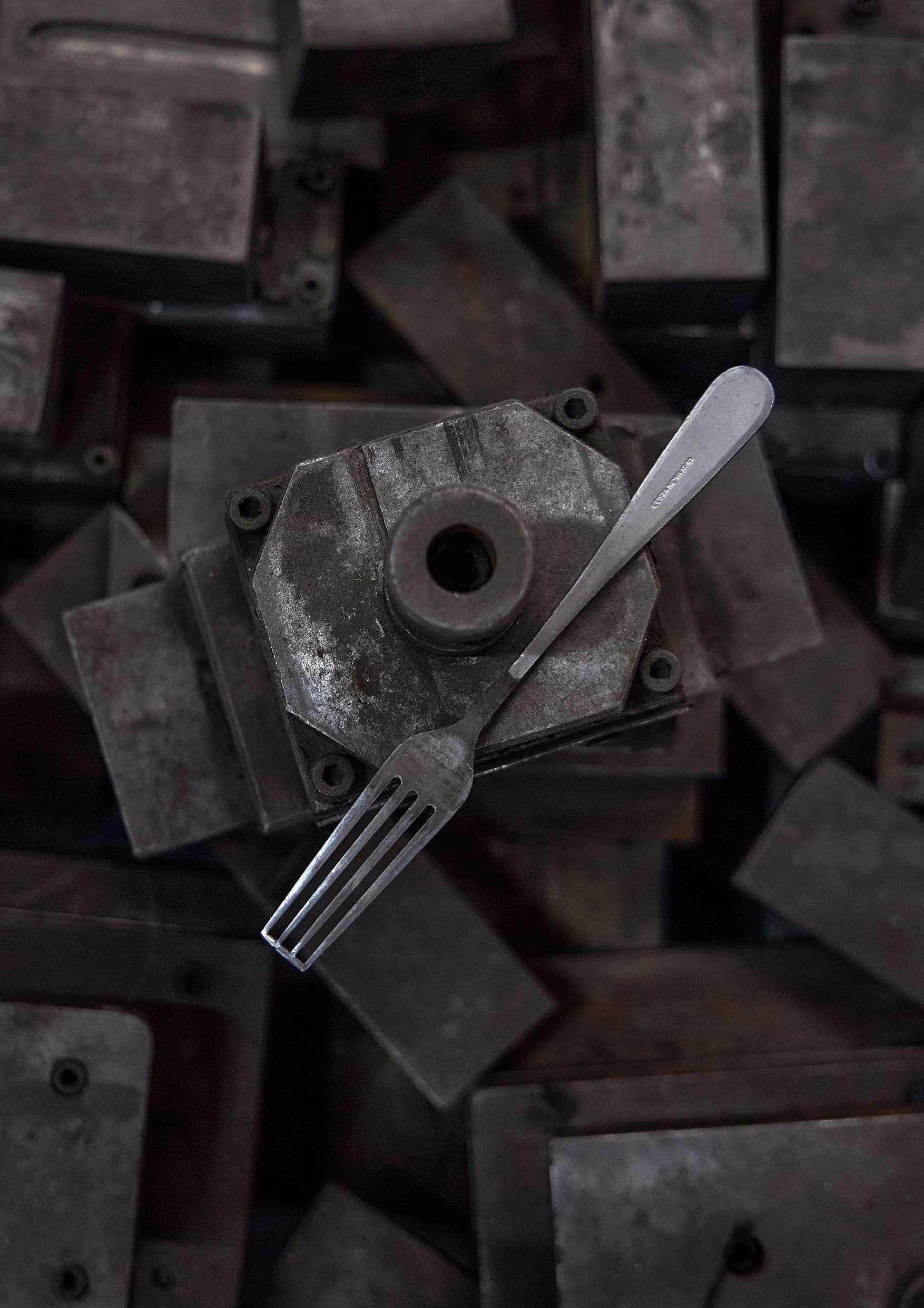 Above, clockwise: Blanked Lumi fork: defined flat outline, sharp-edged. Douro stamped spoon: formed bowl depth, handle contours. Preparing for Lumi blade grinding. Douro fork tooling.