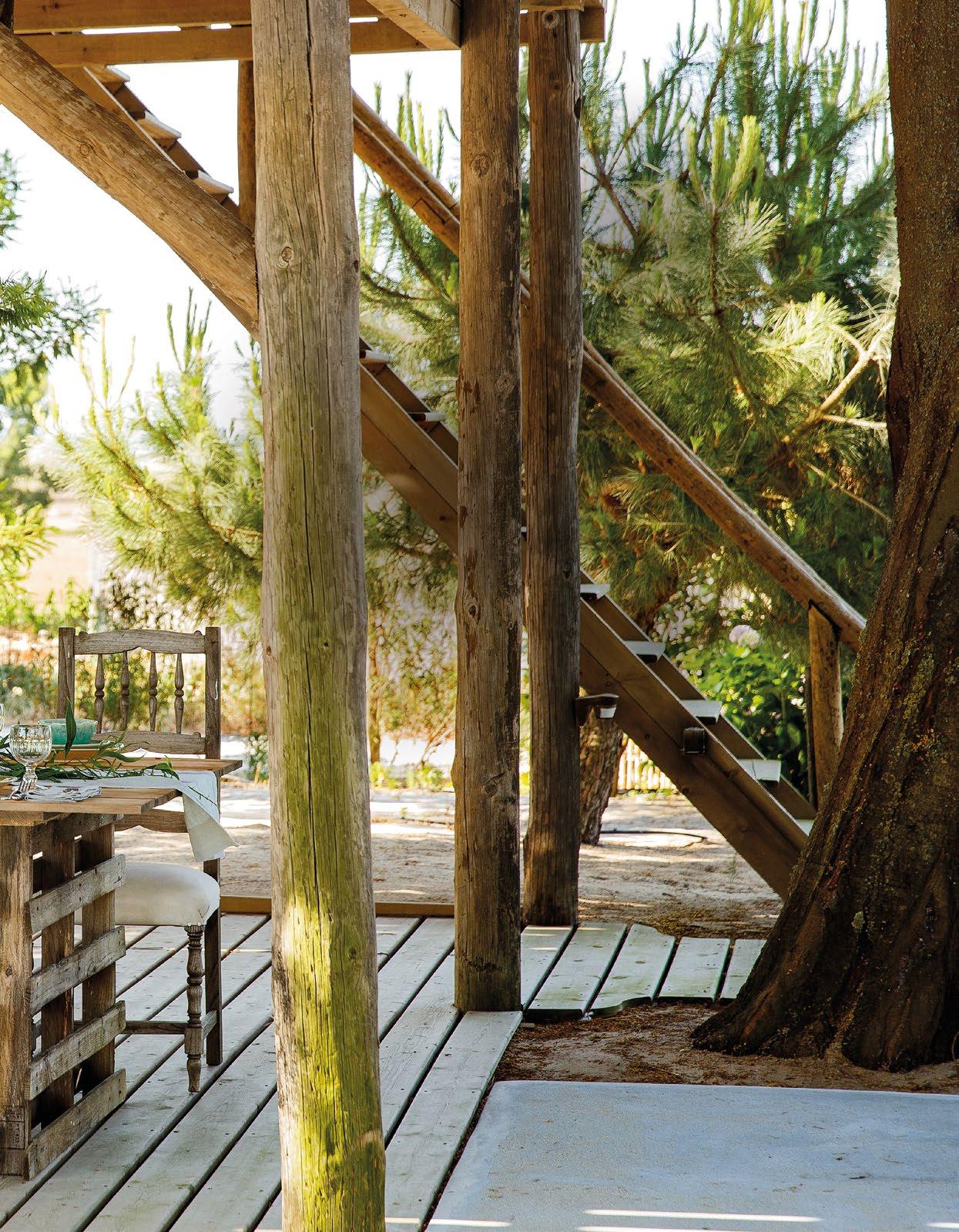 A treehouse provides a shaded retreat for a beautifully set outdoor summer table.