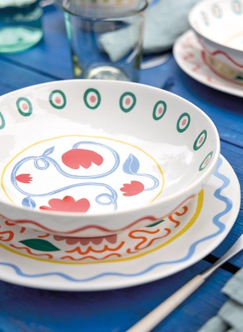 A bohemian take on tableware, accented with two joyful new colors.