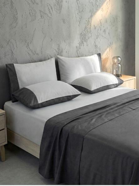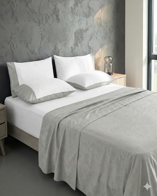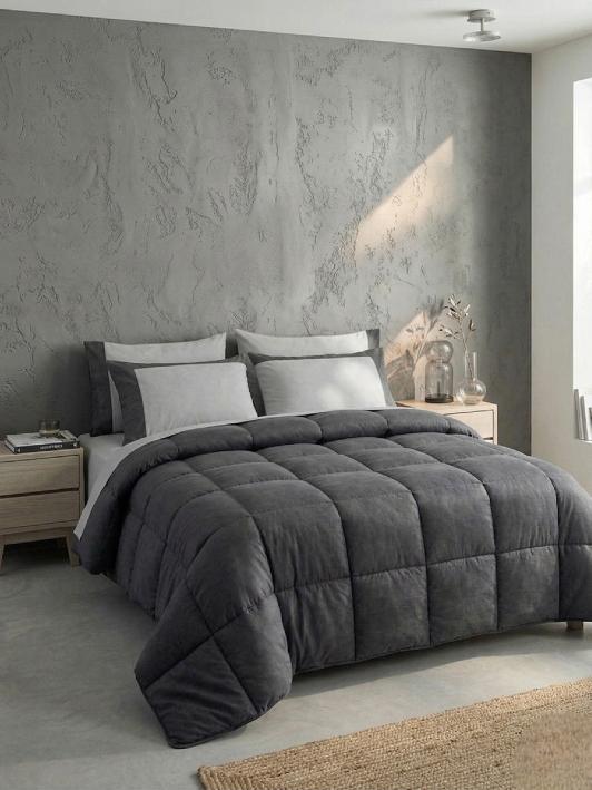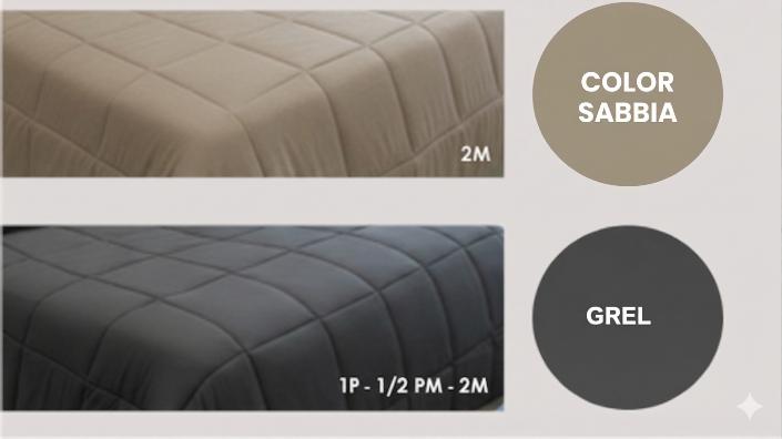 Le due tonalità dialogano tra loro per dare al letto una presenza più composta, più elegante e più attuale, trasformando il completo in un elemento d’arredo capace di ordinare lo sguardo e valorizzare l’ambiente.