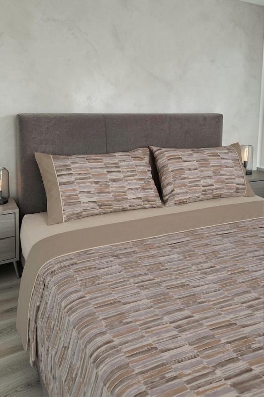 Il finishing Soft Touch ne valorizza la mano morbida e scorrevole, mentre la struttura del tessuto accompagna il riposo con una presenza visiva più ordinata, più armoniosa, più invitante.