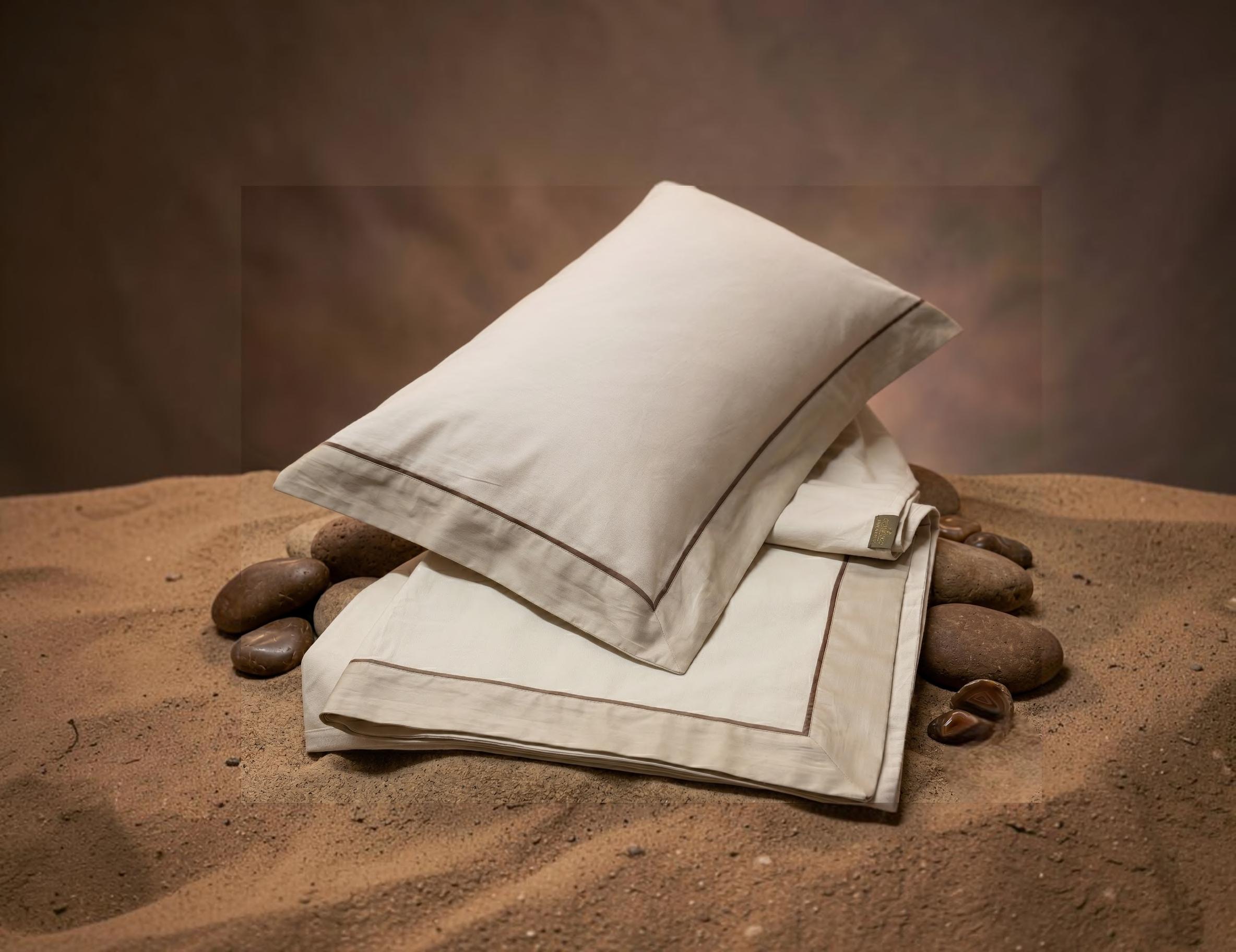 • Il Profilo Piping: Una linea sottile, quasi un tratto di penna, che percorre il set esaltando la profondità della tinta unita. Questo contrasto millimetrico trasforma il lenzuolo in un oggetto di design architettonico, dove il dettaglio non è un accessorio, ma il cardine che fa risaltare la maestosità del colore di base.