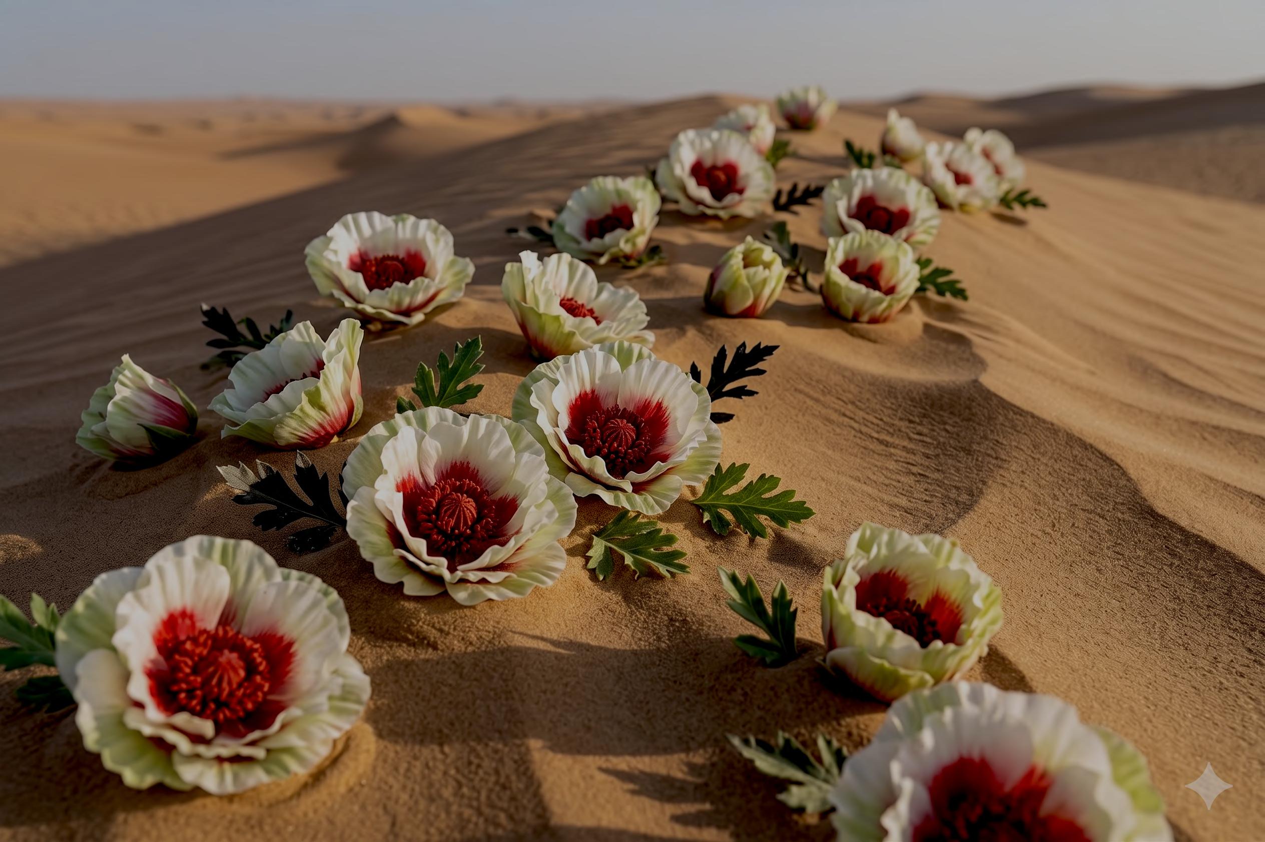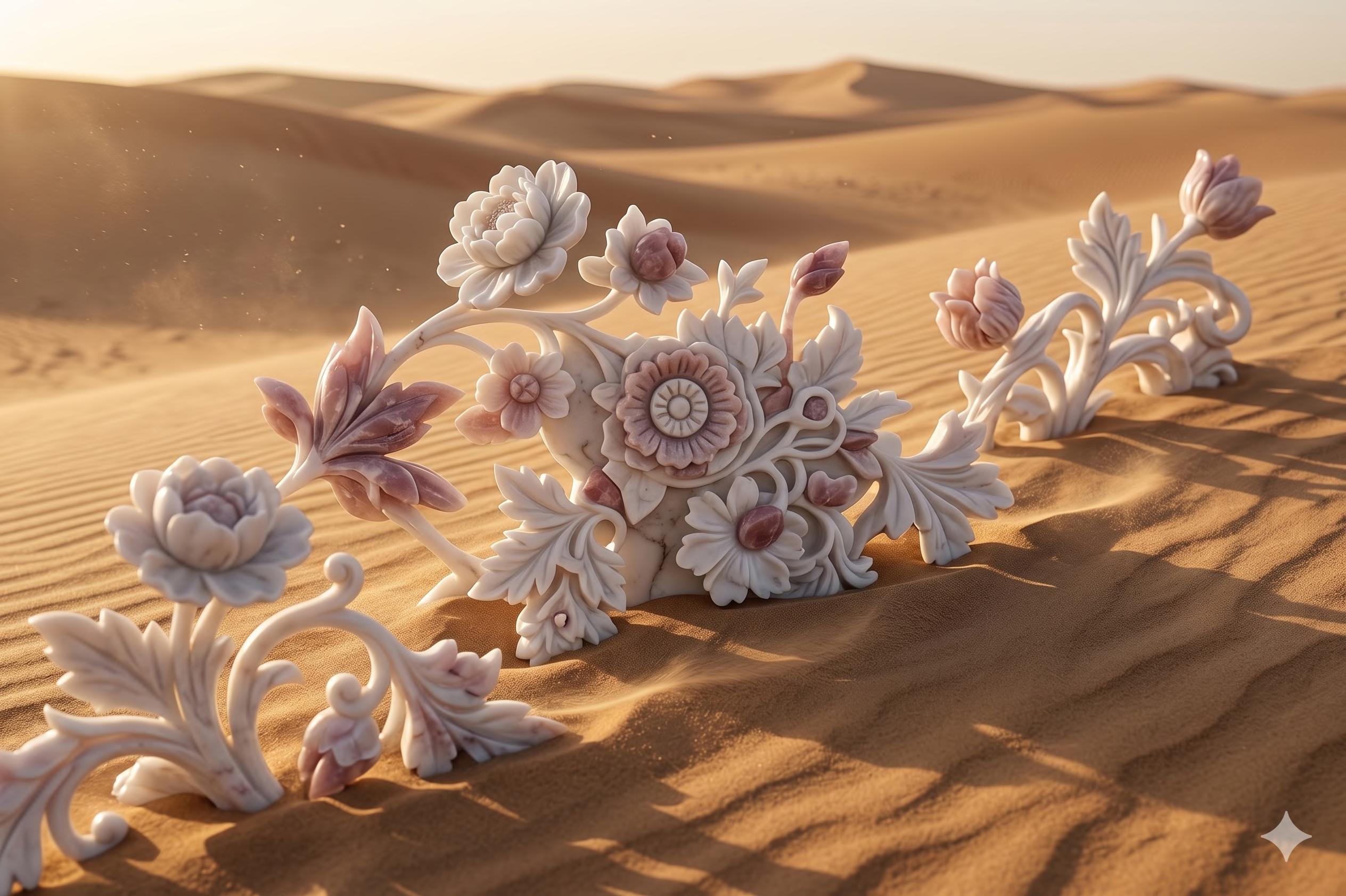 Imagine a Renaissance garden carved in Carrara Marble, resting upon the infinite silence of the desert. Rinascimento is the impossible embrace between the eternal strength of stone and the ephemeral caress of a petal. It is not just a sheet; it is a mirage of comfort taking shape within the dunes of rest.