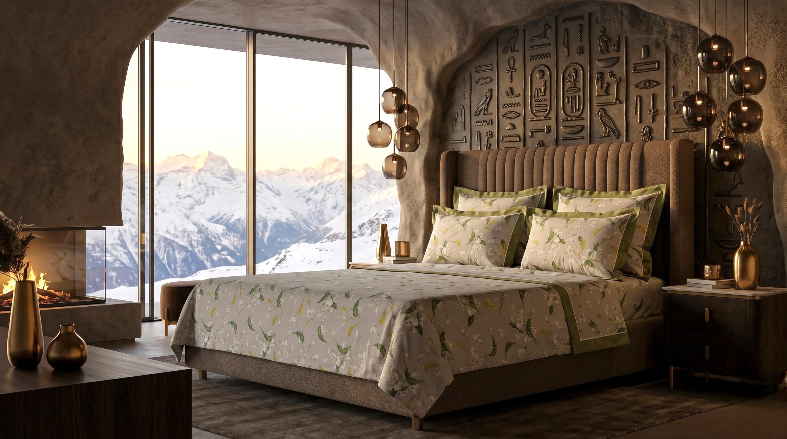 A vibrant pattern, an explosion of petals captured in the perfect moment of their awakening. It is nature gracing the room with aristocratic charm, transforming the bed into a bucolic sanctuary where time stands still , Victorine is the blossom turning into light THE ALCHEMY
