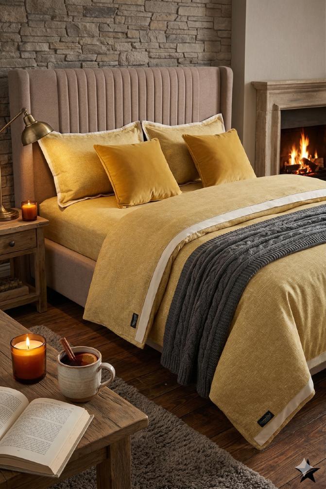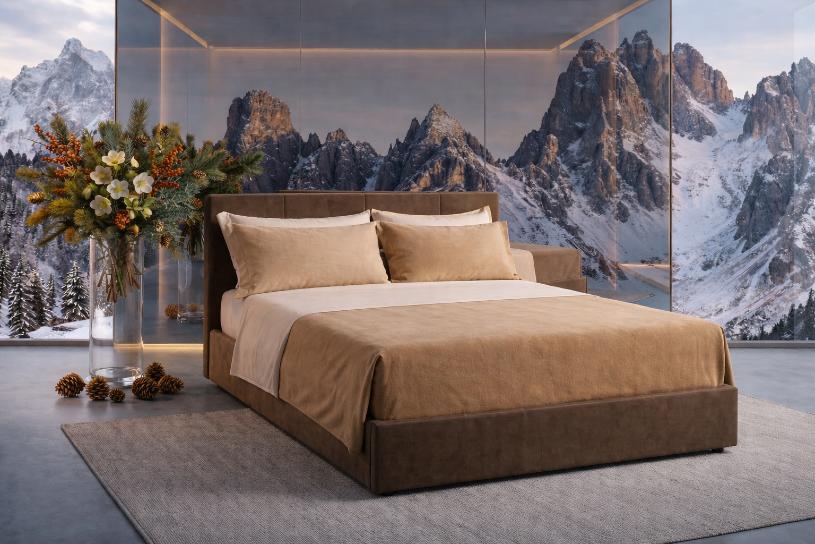 Oro interpreta l’inverno con una luce morbida e preziosa, capace di rendere il letto più ricco e immediatamente accogliente.