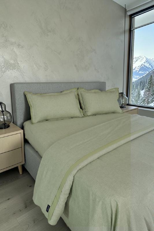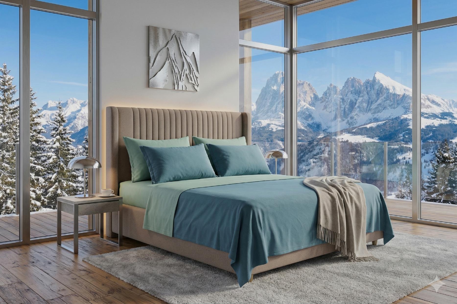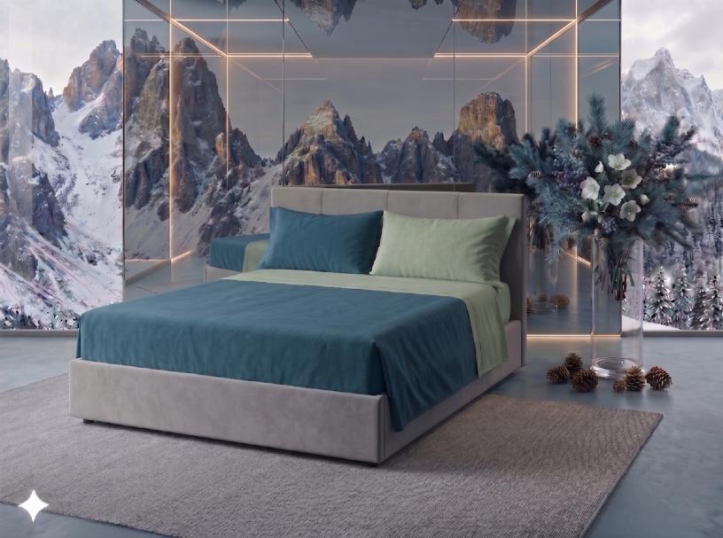 Paesaggio interpreta il verde menta in una chiave soffusa e raffinata, portando sul letto una sensazione di respiro, quiete e leggerezza. È una variante che comunica benessere visivo e rinnova la palette invernale con una nota più originale e distintiva.