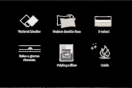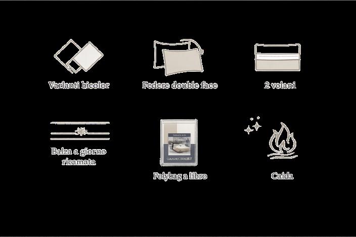 Le sue varianti in tinta unita sono costruite sul dialogo armonioso tra due tonalità, mentre le federe con 2 volani, realmente double face, possono essere utilizzate da entrambi i lati per offrire maggiore versatilità al letto.