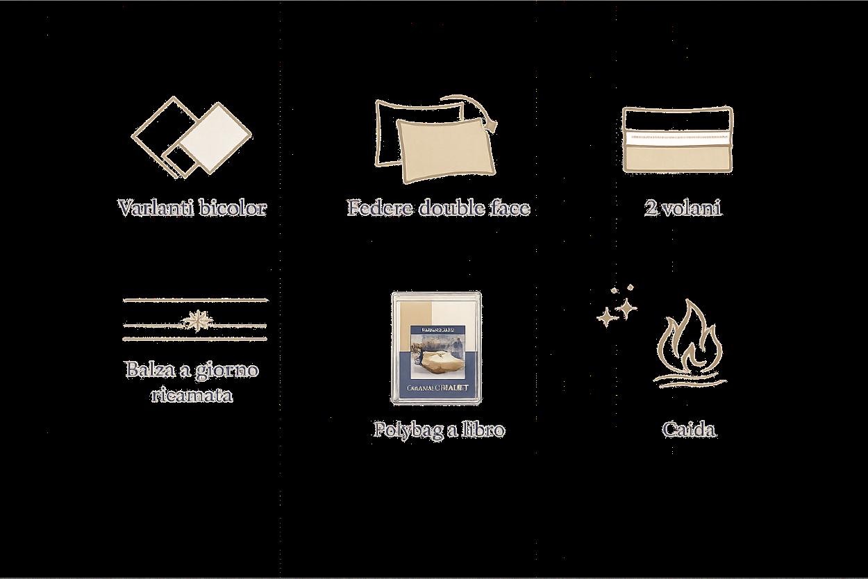 Il lenzuolo sopra è rifinito con balza a giorno e impreziosito da un piccolo ricamo a contrasto, dettaglio discreto che completa la linea con eleganza.