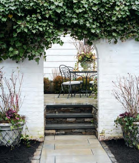 Tucked away, the Secret Garden designed by landscape designer Kelly McGovern was given a new lease on life with hardy plantings and complementary hardscape. Shown here in Riverside Multi, porcelain pavers from the Gault Collection are not only good looking but extremely durable—resistant to fading, scratching, staining, mildew and frost—to stand up to harsh New England weather.