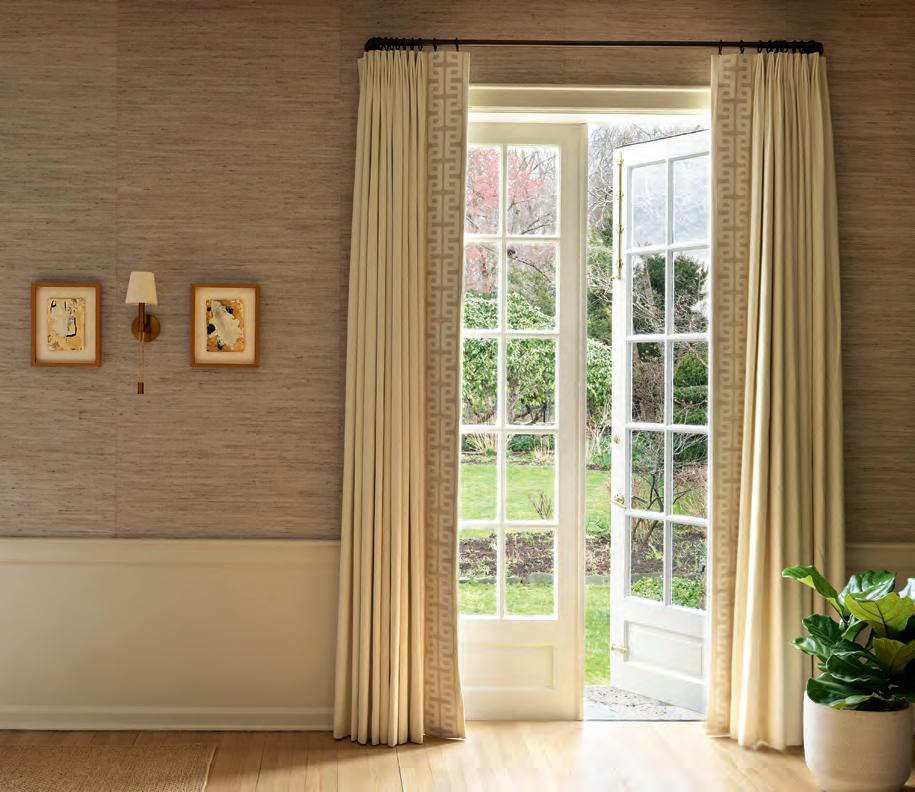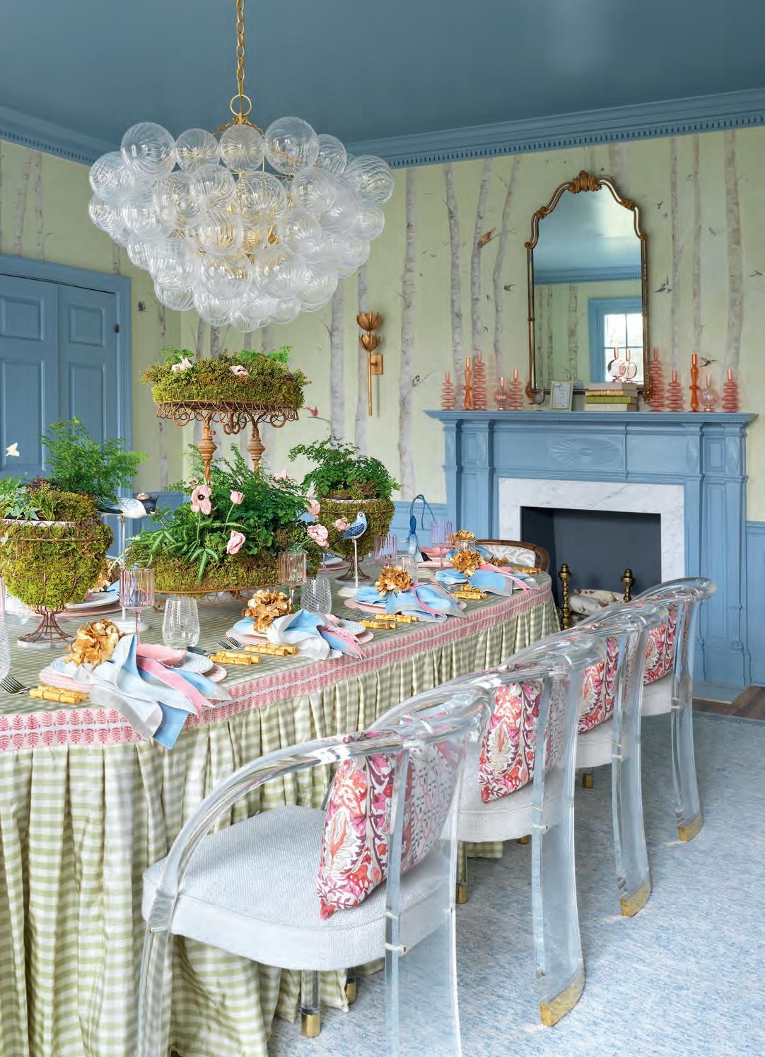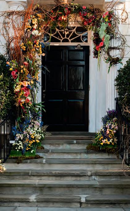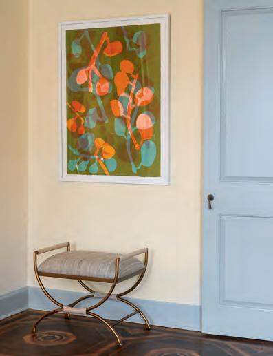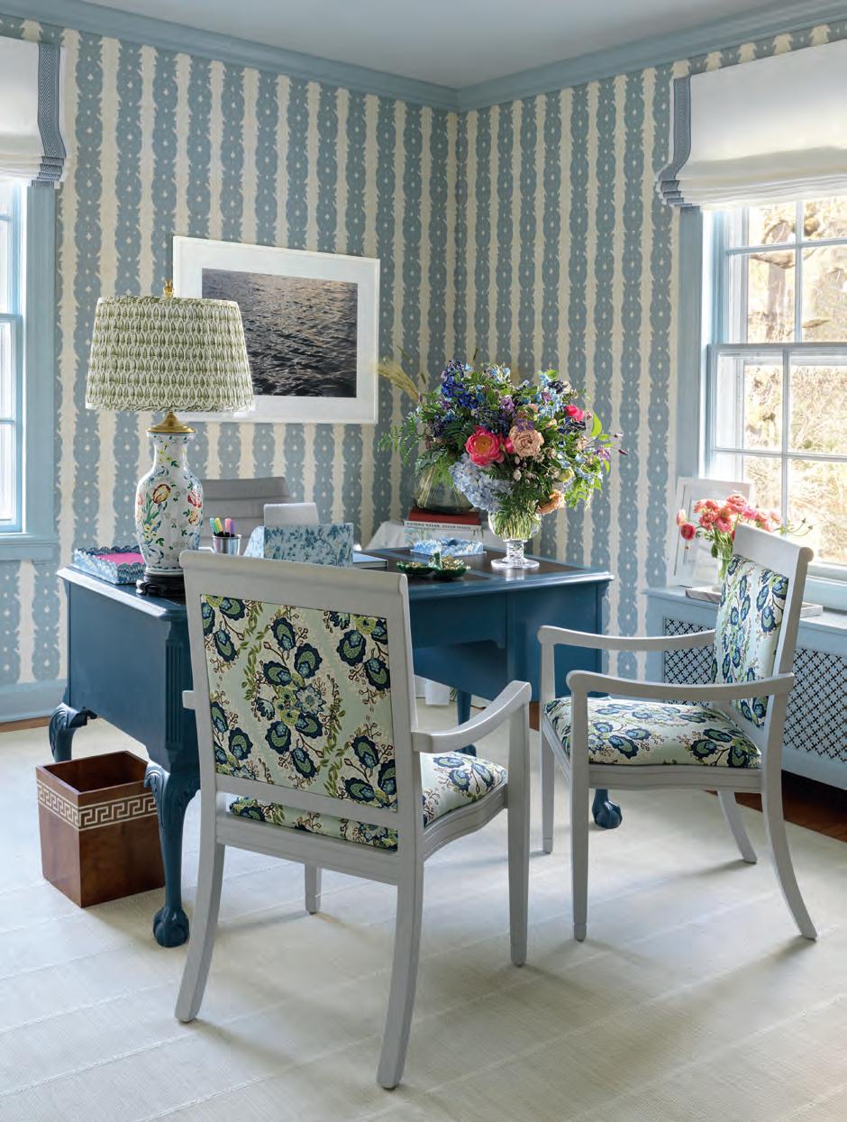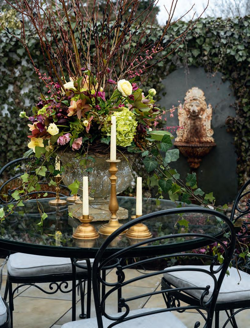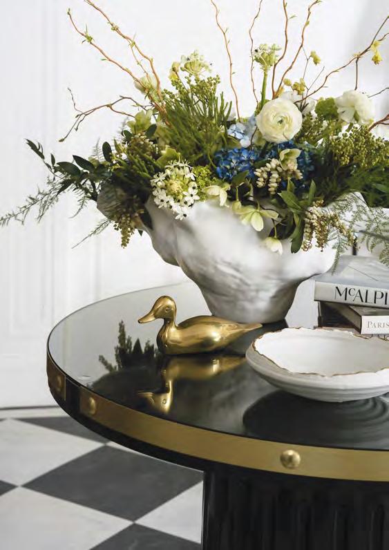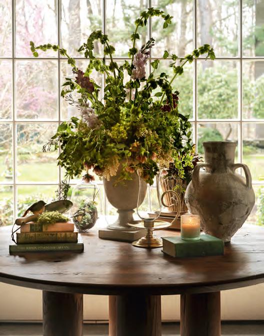 The inviting floral display at the entry to the showhouse was created by Robert Sabia of Nielsen’s Florist and Garden Shop. Utilizing curly willow and grapevine as the base for the doorway swag, he wove in flowers typically found in a spring cutting garden, including roses, hellebores and delphiniums. Family owned and operated, Nielsen’s has been serving the local community since 1944. nielsensflorist.com.