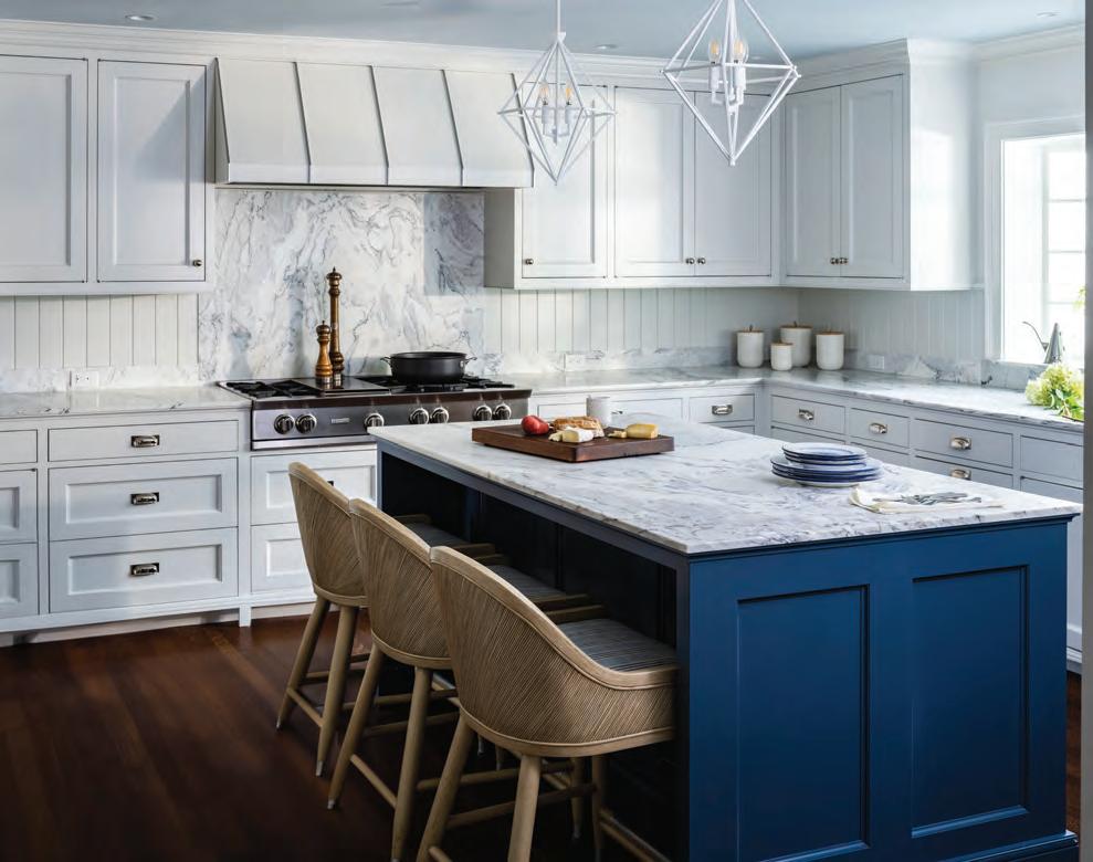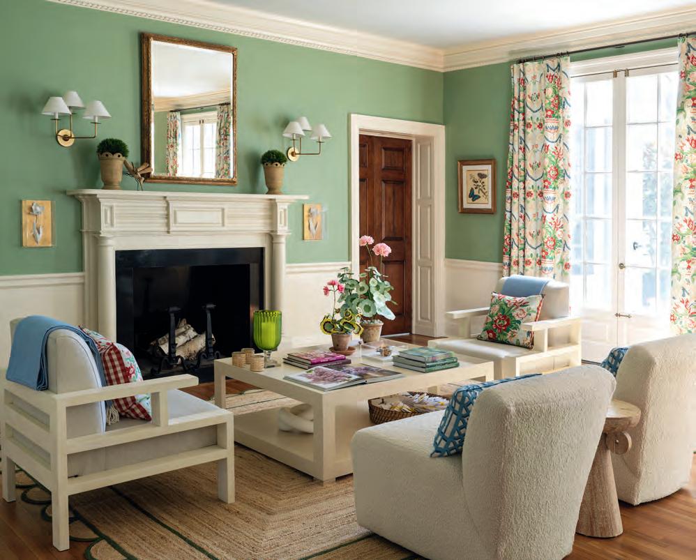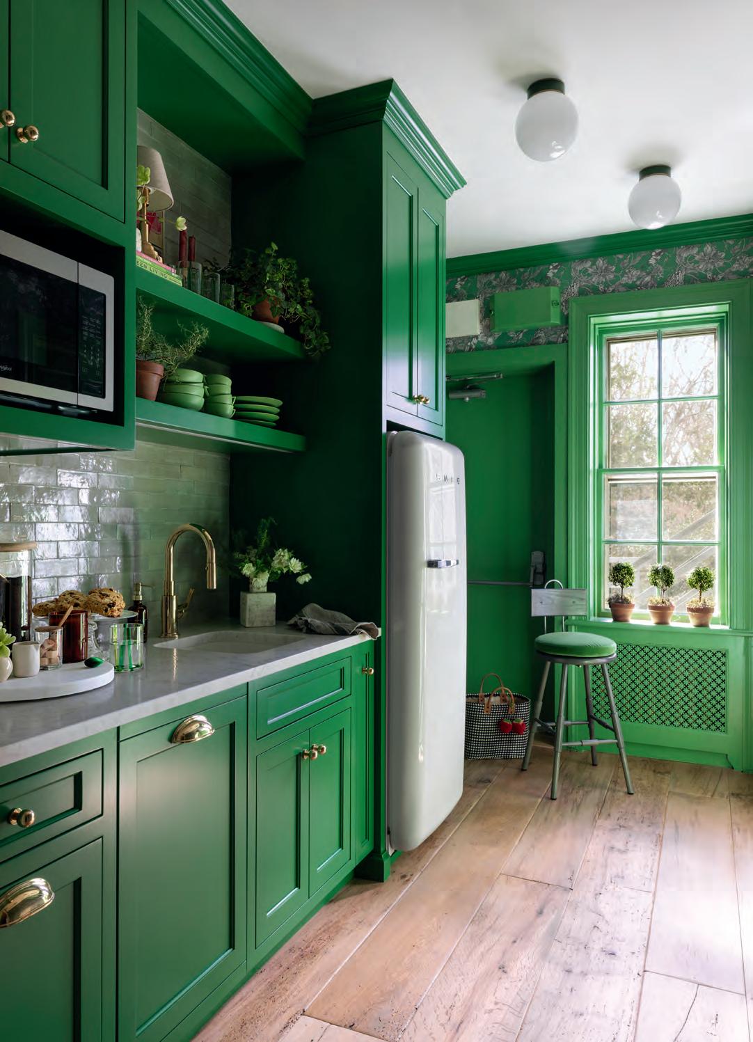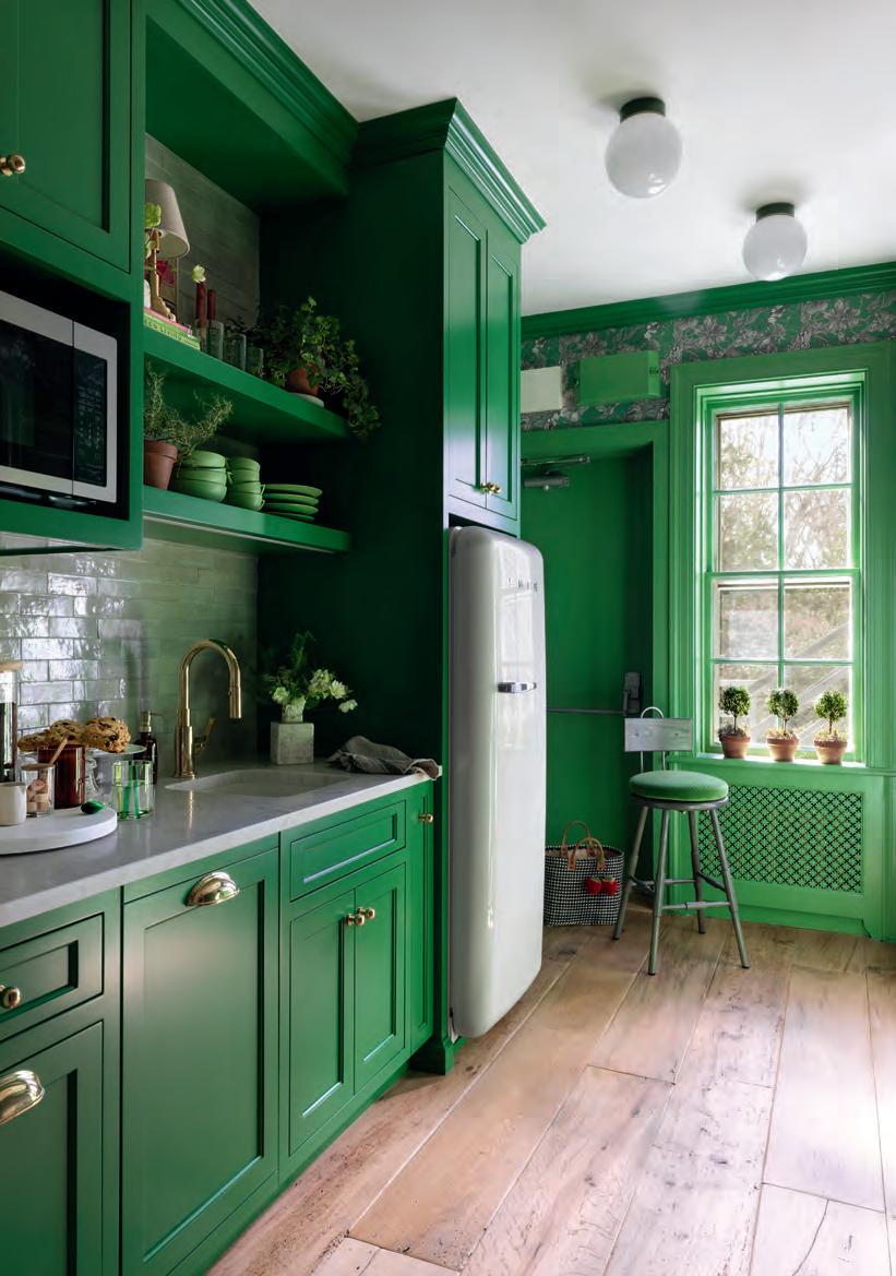 Karen Bow believes an abundance of color becomes a neutral in a room. She used two different shades of green with two different finishes to achieve an English-style kitchen. From Ring’s End, she selected Farrow & Balls’ Danish Lawn for the cabinetry and Raw Tomatillo for the trim and doors. ringsend.com, farrow-ball.com.