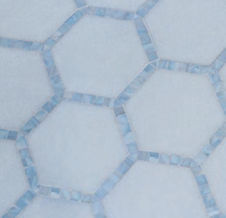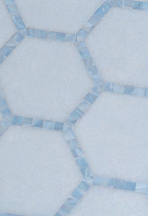 In the Bridal Suite bathroom, designer Elena Phillips specified elegant Onyx France tile from Tile America. She paired a white Thassos marble hexagon with a mother of pearl mosaic outline for a sparkling, jewelry-like tileamerica.com.