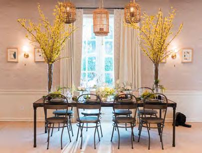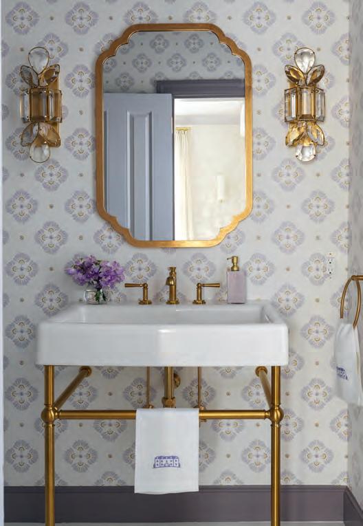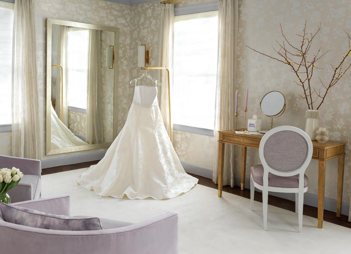 Timeless and feminine, the Bridal Suite bathroom is outfitted with fixtures and accessories from DXV’s Oak Hill portfolio from Torrco. Elena Phillips chose a satin brass finish for the console, high spout lever hand faucet and towel ring, married with a DXV sink in Canvas White. torrcodesigncenter. com.