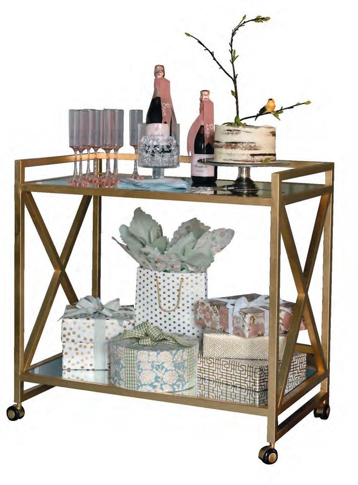 OKA’s Louis Bar Cart in Sarina Galu’s dining room serves up style in a brushed gold finish with crossed metal sides and mirrored surfaces. Use as a dessert cart, as shown here, or as a bar set up. Castors allow you to wheel the cart wherever needed. oka.com.