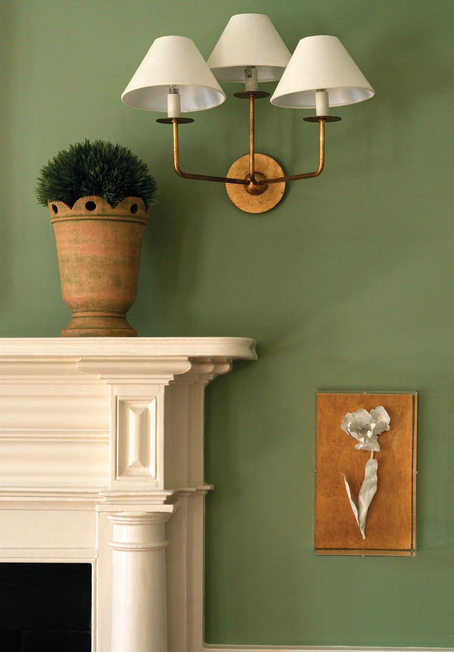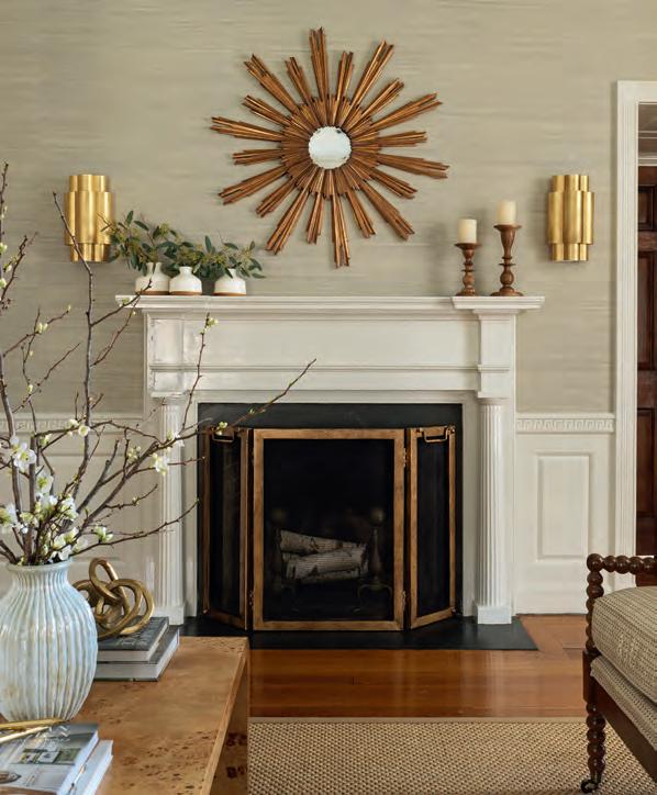 Visual Comfort supplied the showstopping lighting for the interiors and exterior of the DCA estate, including the striking Kelley triple sconces in Gilded Iron selected by Carey Karlan to flank the fireplace in the McKitterick Room. visualcomfort.com.