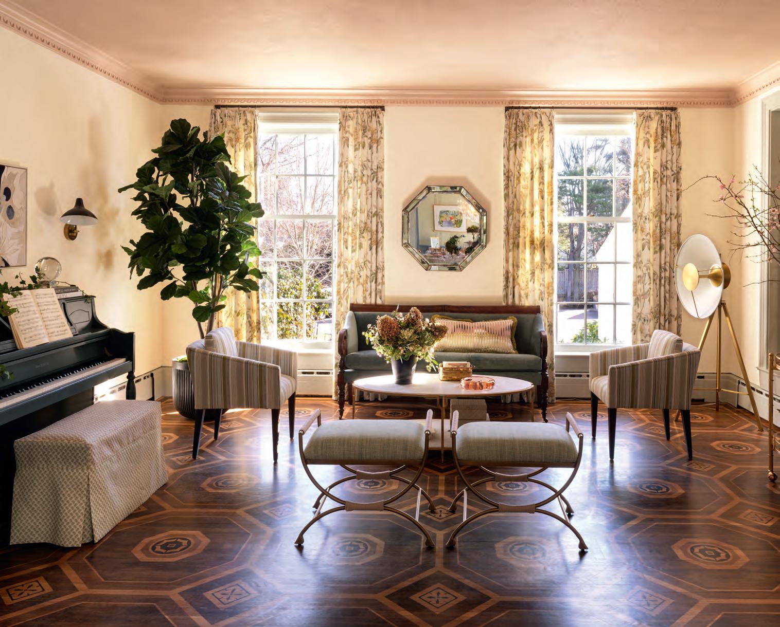 Interior designer Fiona Leonard enlisted the help of decorative painter Shelly Denning to refresh the tired wood floors in the East Room. The original yellow/orange stain was dated but hiding it with a rug could pose a tripping hazard. The solution, an eye-catching octagonal pattern created by Denning with multiple stains applied in various hues. @shellypaint.