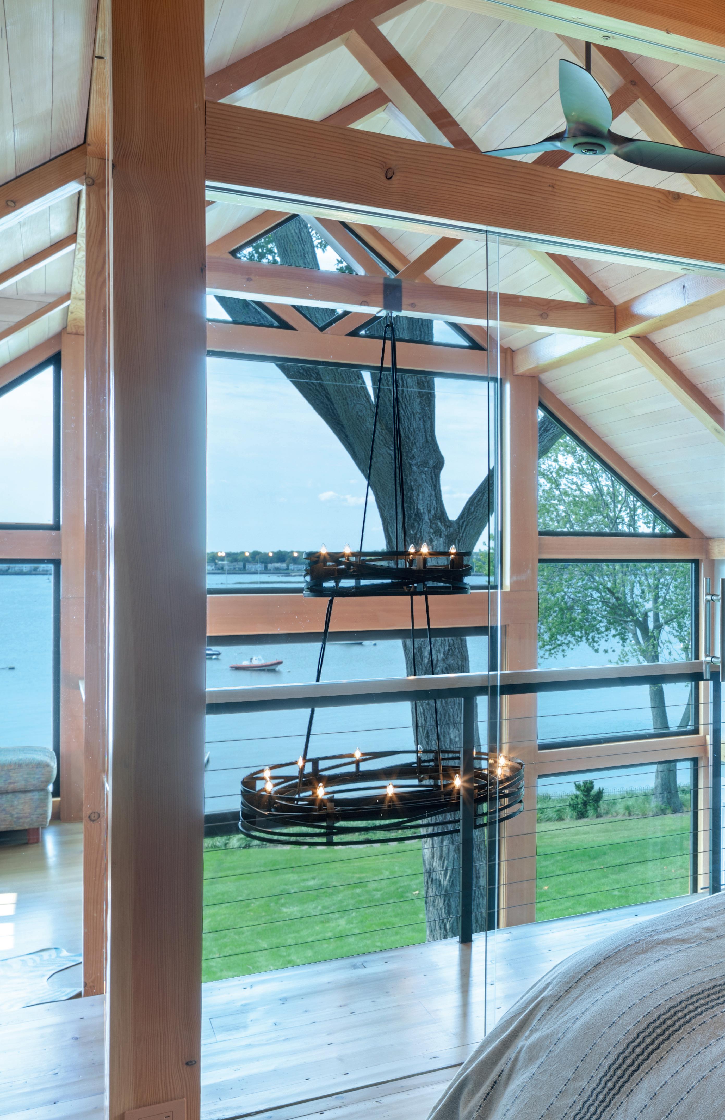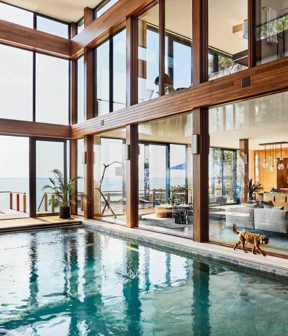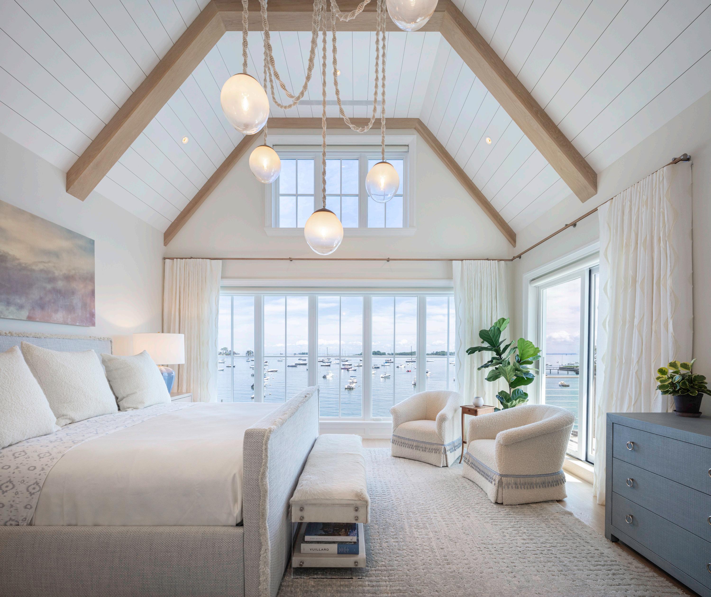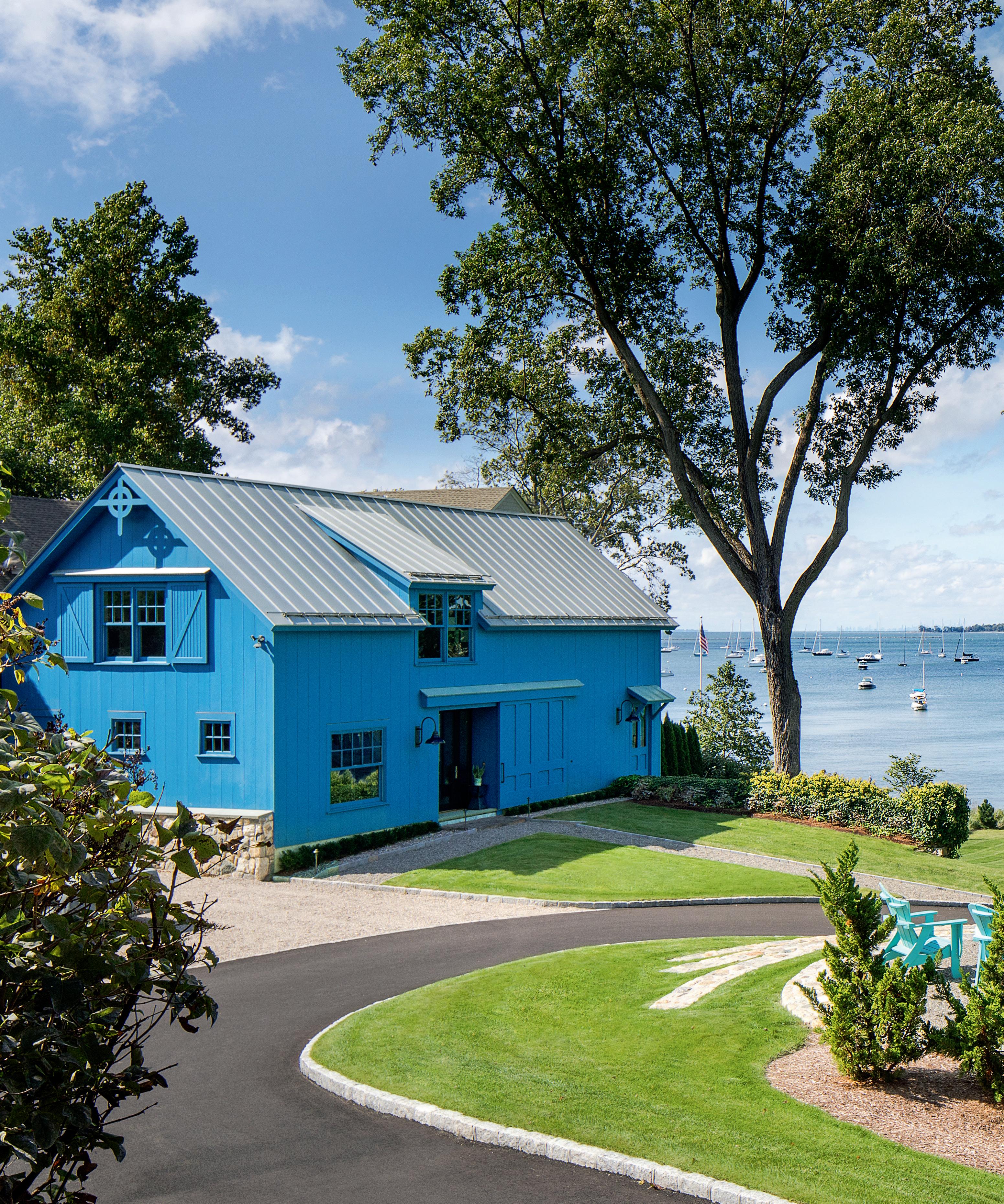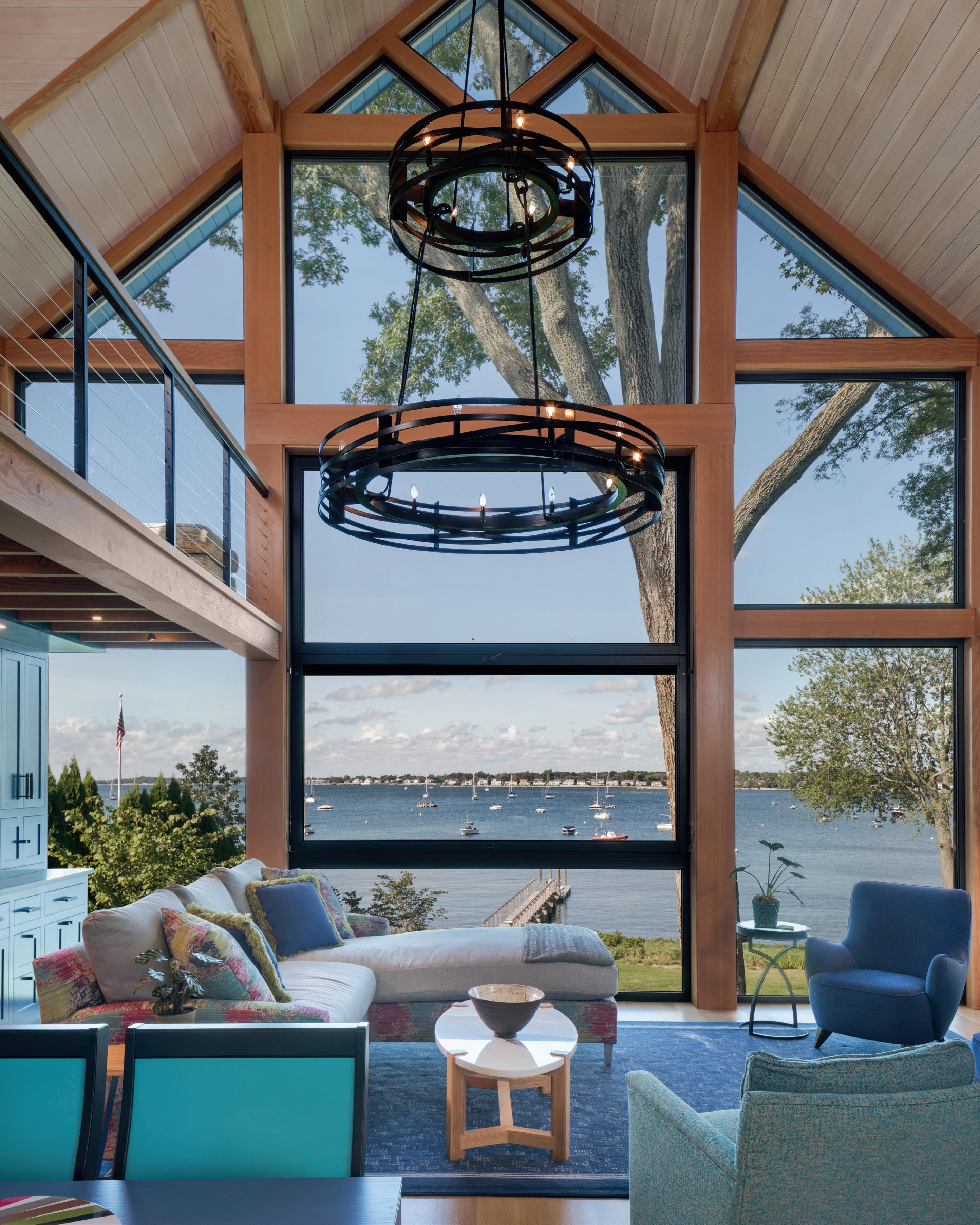 A house on the coast of Long Island Sound reflects the water and basks in the light
