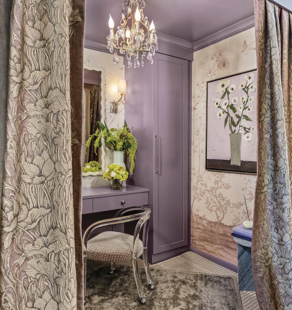 “Marie’s Retreat was inspired by my late grandmother and her ritual of getting dressed as an act of self-respect and grace. The space is wrapped in soothing lavender tones and layered with soft neutrals. The botanical bamboo wallcovering was chosen intentionally, as bamboo symbolizes strength and resilience, which very much reminds me of my grandmother. The space serves as a reminder to slow down, take pride in simple daily rituals, and make time to pour into yourself before pouring into others.”—Naïka André, NJA Interiors, njainteriors.com