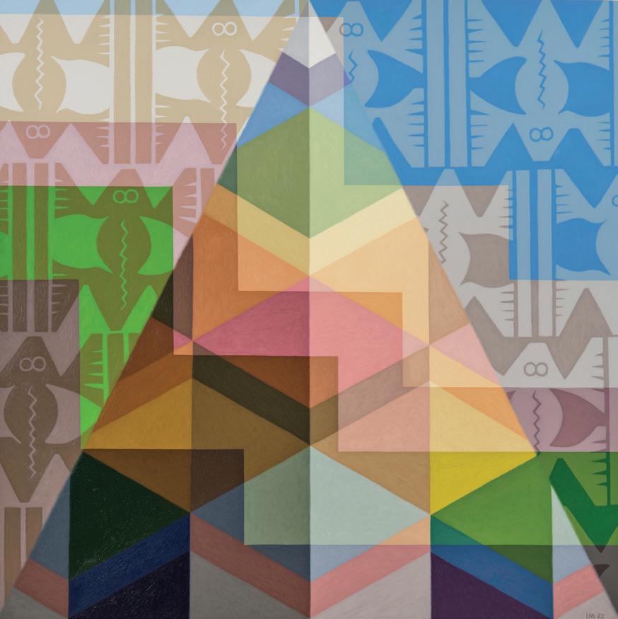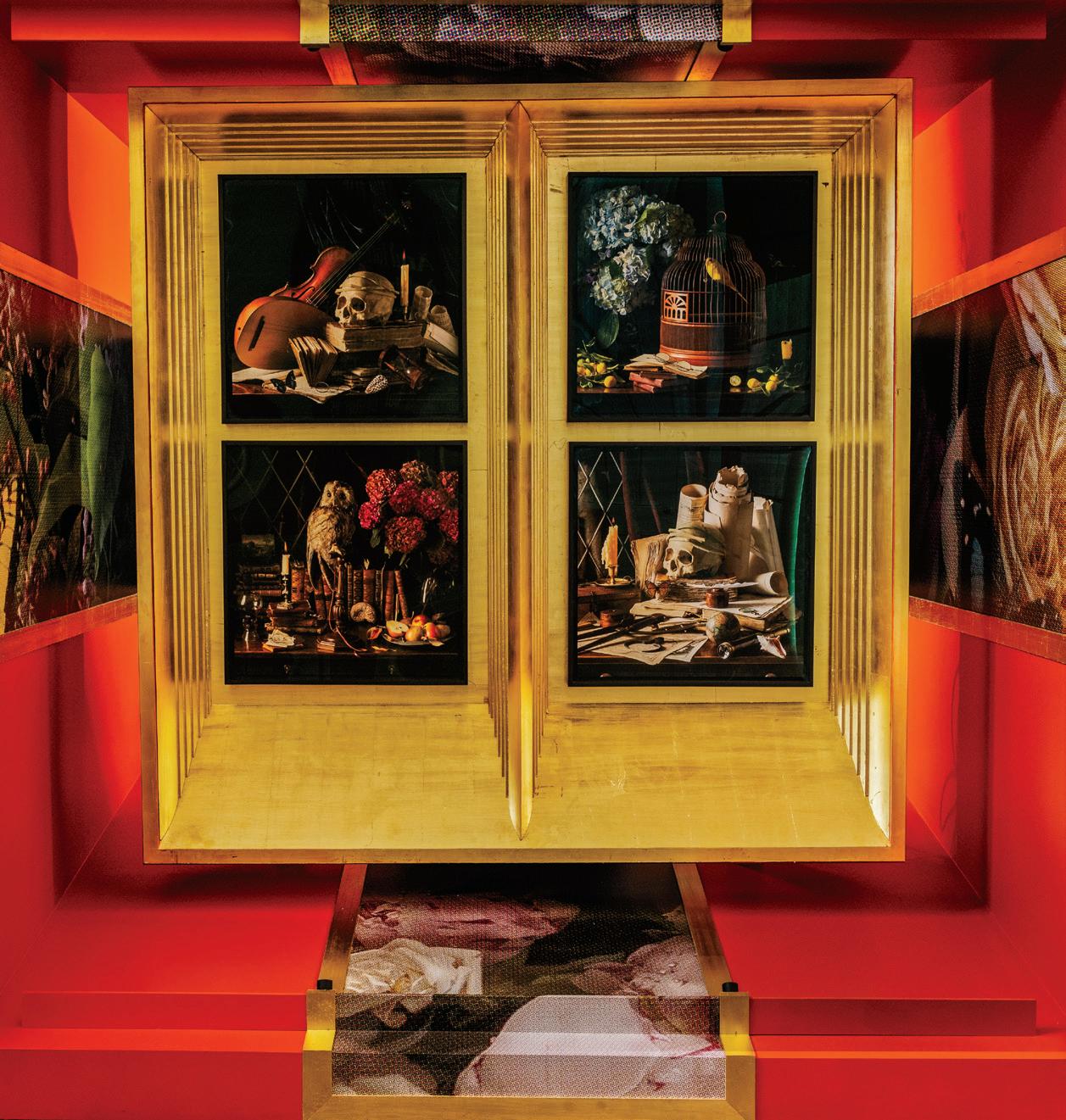 “Gilded 14th-century Italian religious art is the springboard for this vignette. Inspired by the work of painters like Duccio di Buoninsegna and Giovanni Cimabue, it provides a floating framework for the Paulette Tavormina’s powerful photographs. Her images— rooted in Dutch, Spanish and Italian Old Masters paintings— add layers of history to this assemblage. Suspended in vermilion, Ikahnētass is anchored by black horizontal and vertical bands that move toward the viewer, terminating in pixelated flowers drawn from Tavormina’s compositions.”