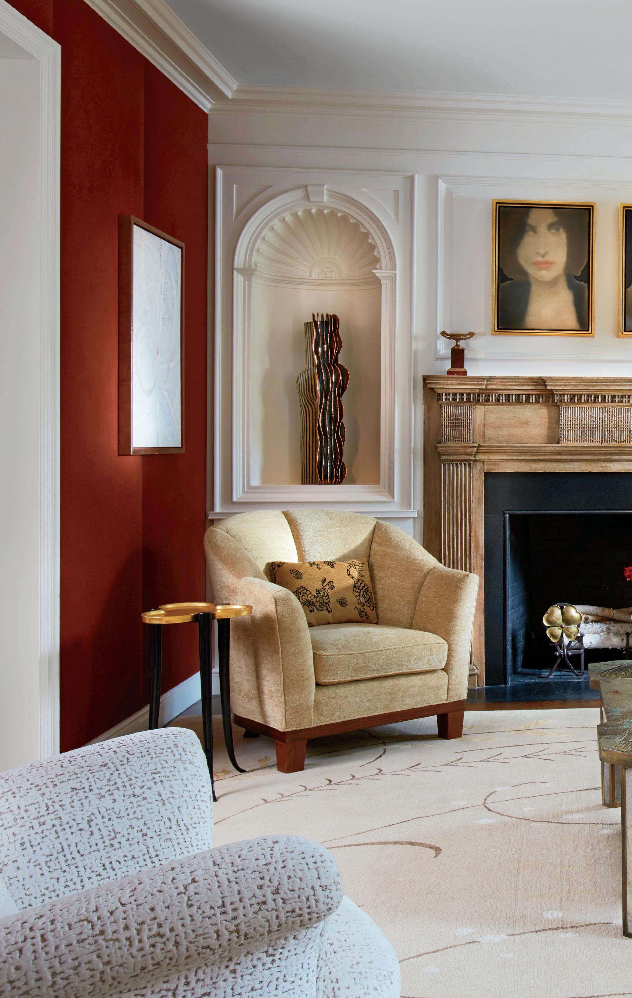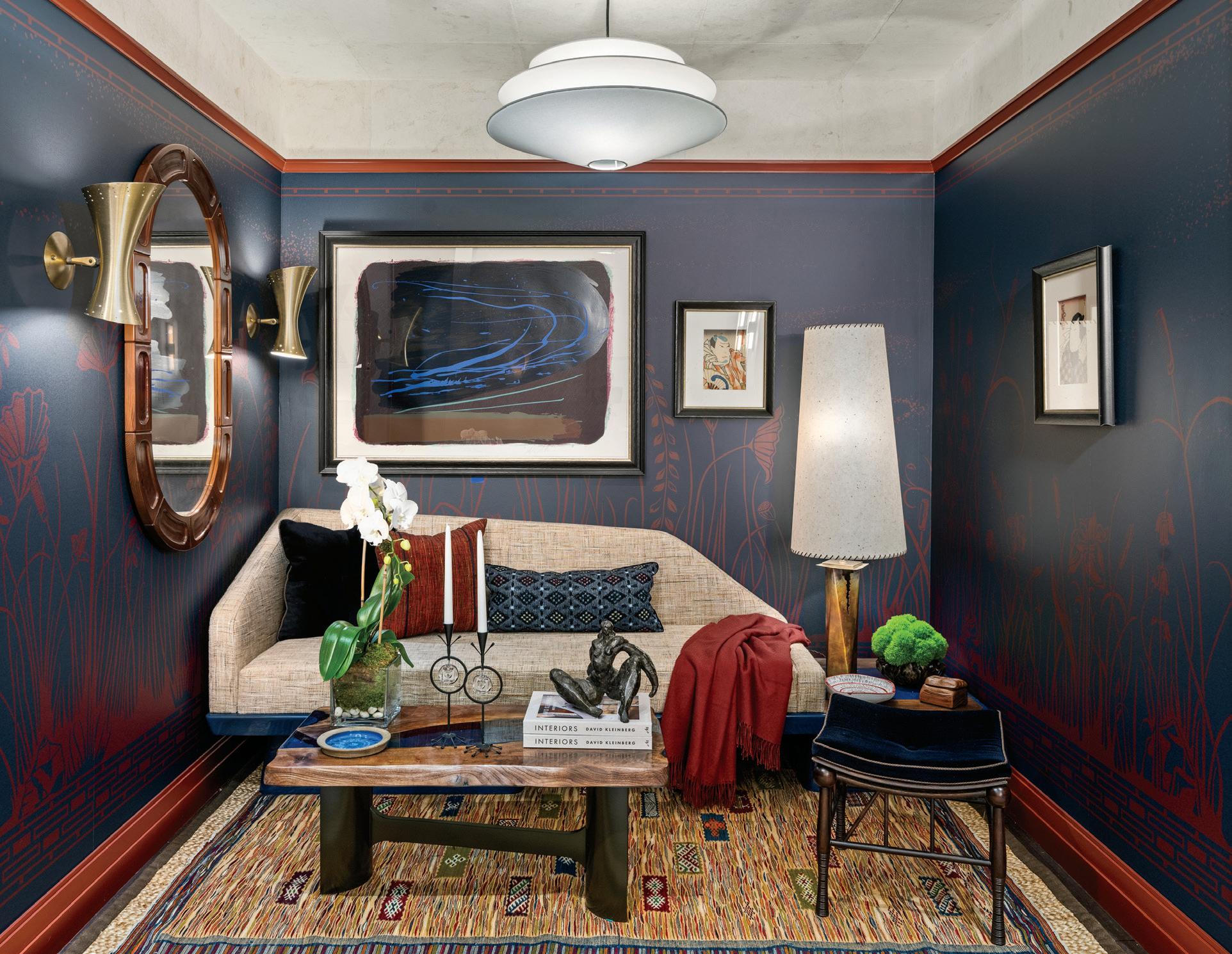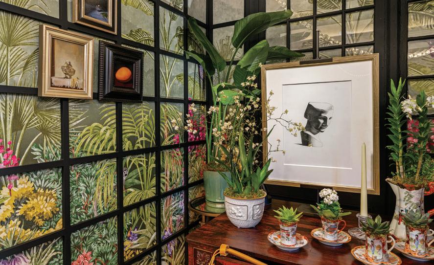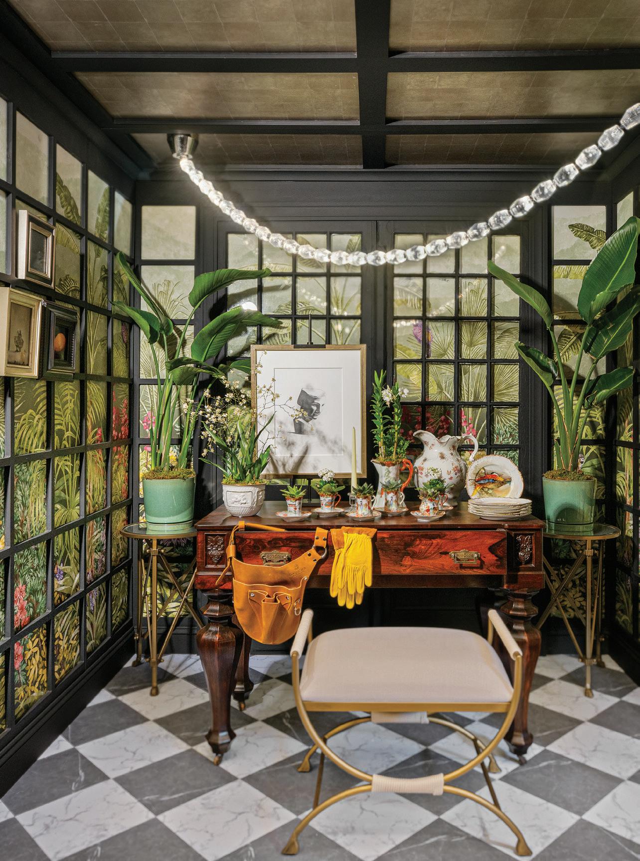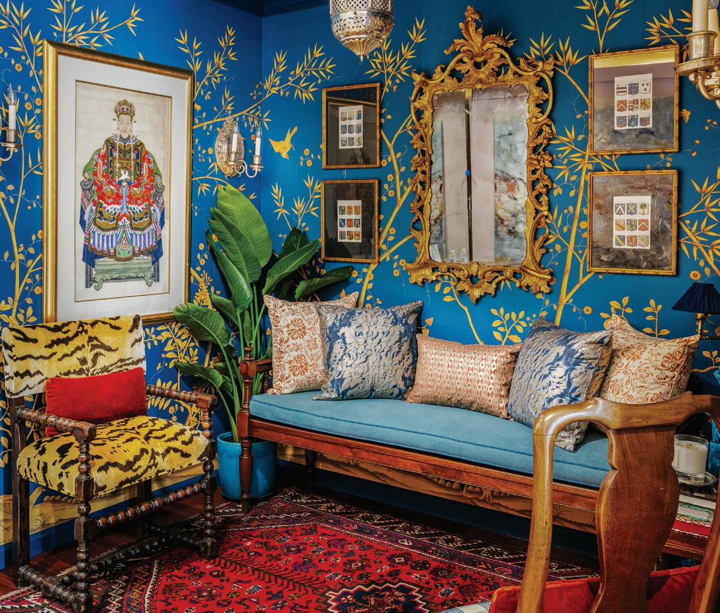 “I envisioned a room within the renowned San Francisco townhome of art collector Ann Getty (1941–2020) and reimagined Mrs. Getty’s adoration for 18thcentury furnishings. A hand-painted chinoiserie wallpaper by Fromental in the Paradiso pattern serves as the foundation of the room; turmeric-colored birds, flowers and trees sway languidly on a vibrant, teal silk ground. Surrounded by this jewel box, Mrs. Getty pauses for a quiet moment before joining her ladies in a Mahjong game room.”—Blake Funston, Blake Funston Interiors, blakefunston.com