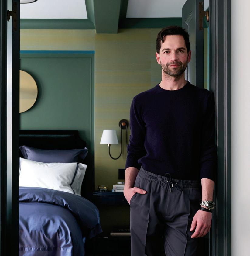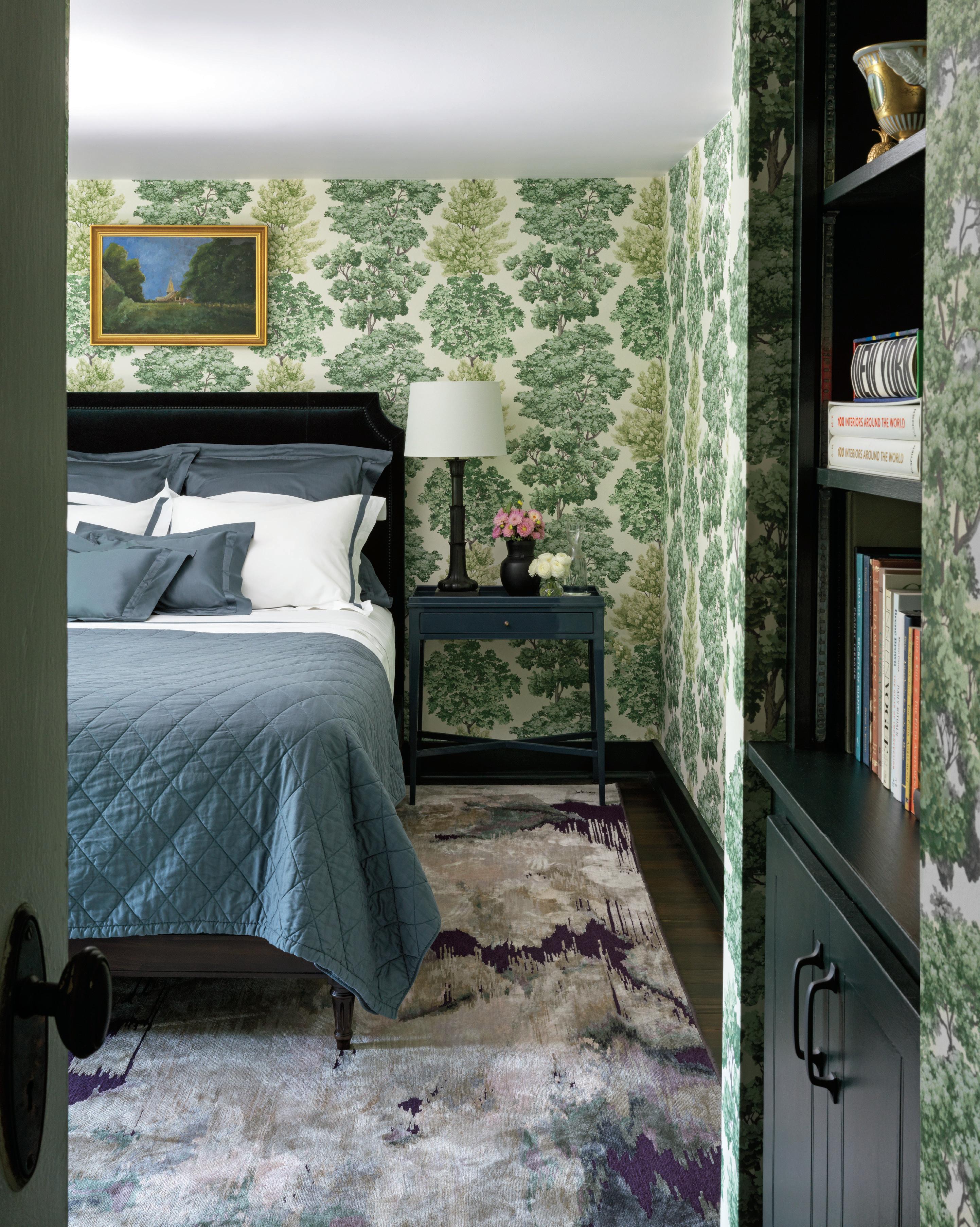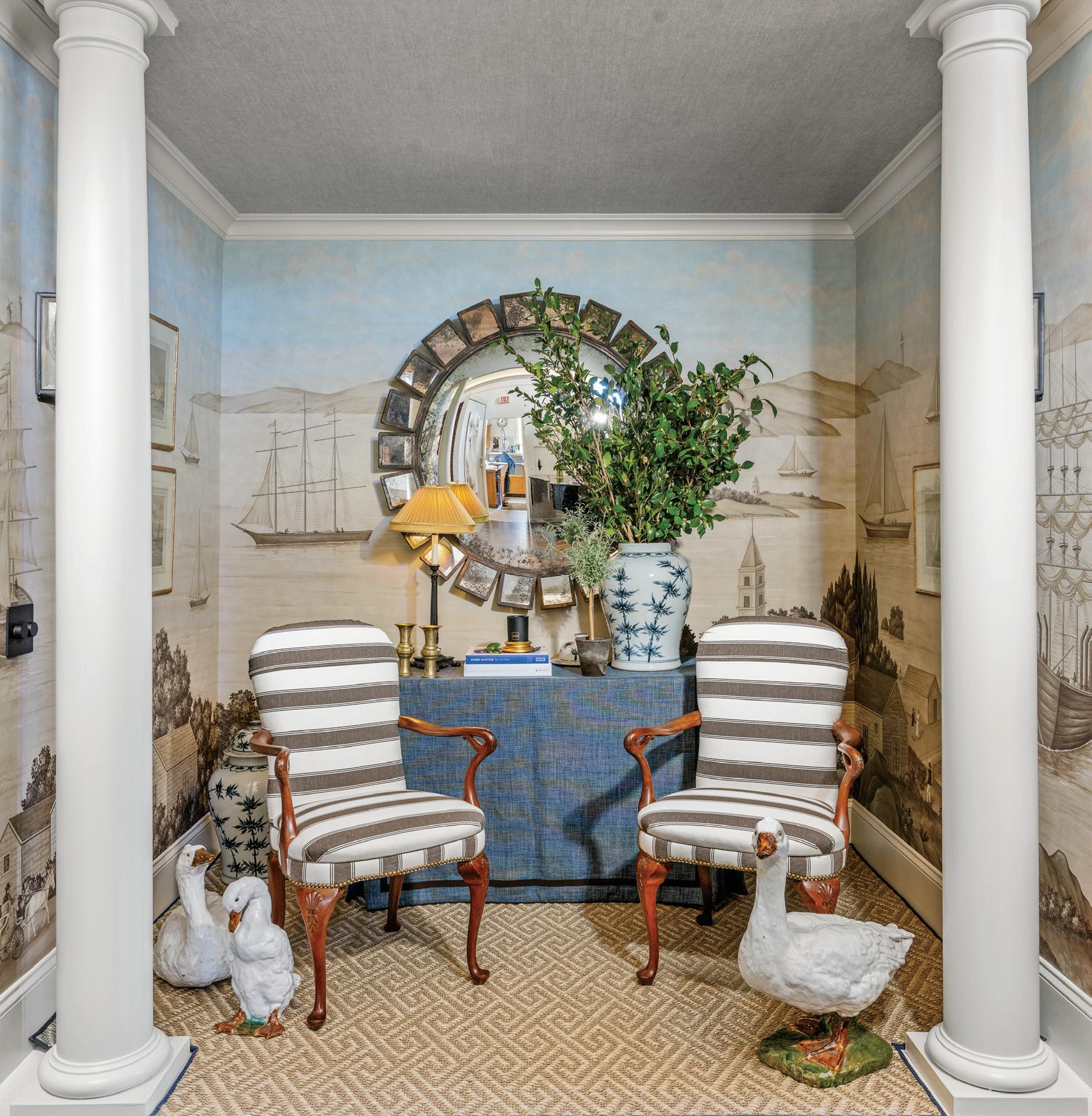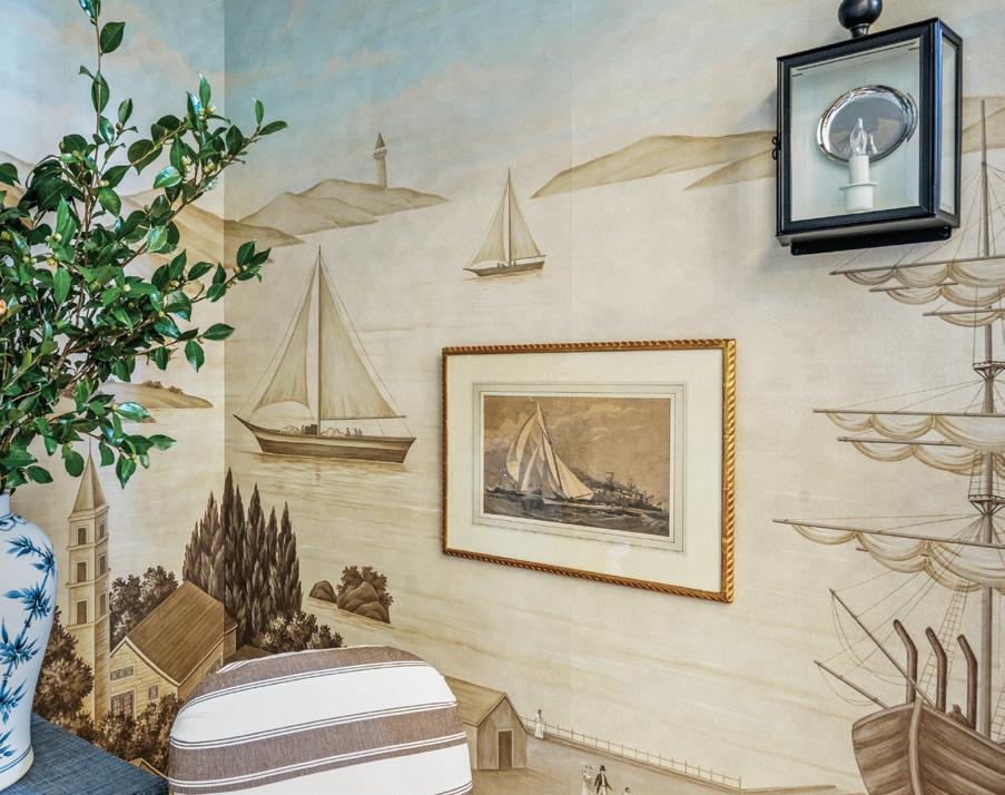 “My room was inspired by the seaport and the unique landscape of New England where the lands meets the sea. Southport exists due to its harbor and proximity to major ports such as New York City and the railroads. The room began with the wallpaper from Gracie. I loved the sepia tones and blue sky. I decided to keep it simple, peaceful and quiet. The bold stripe on the chairs felt right!”—Matthew Kowles, Matthew Kowles, matthewkowles.com