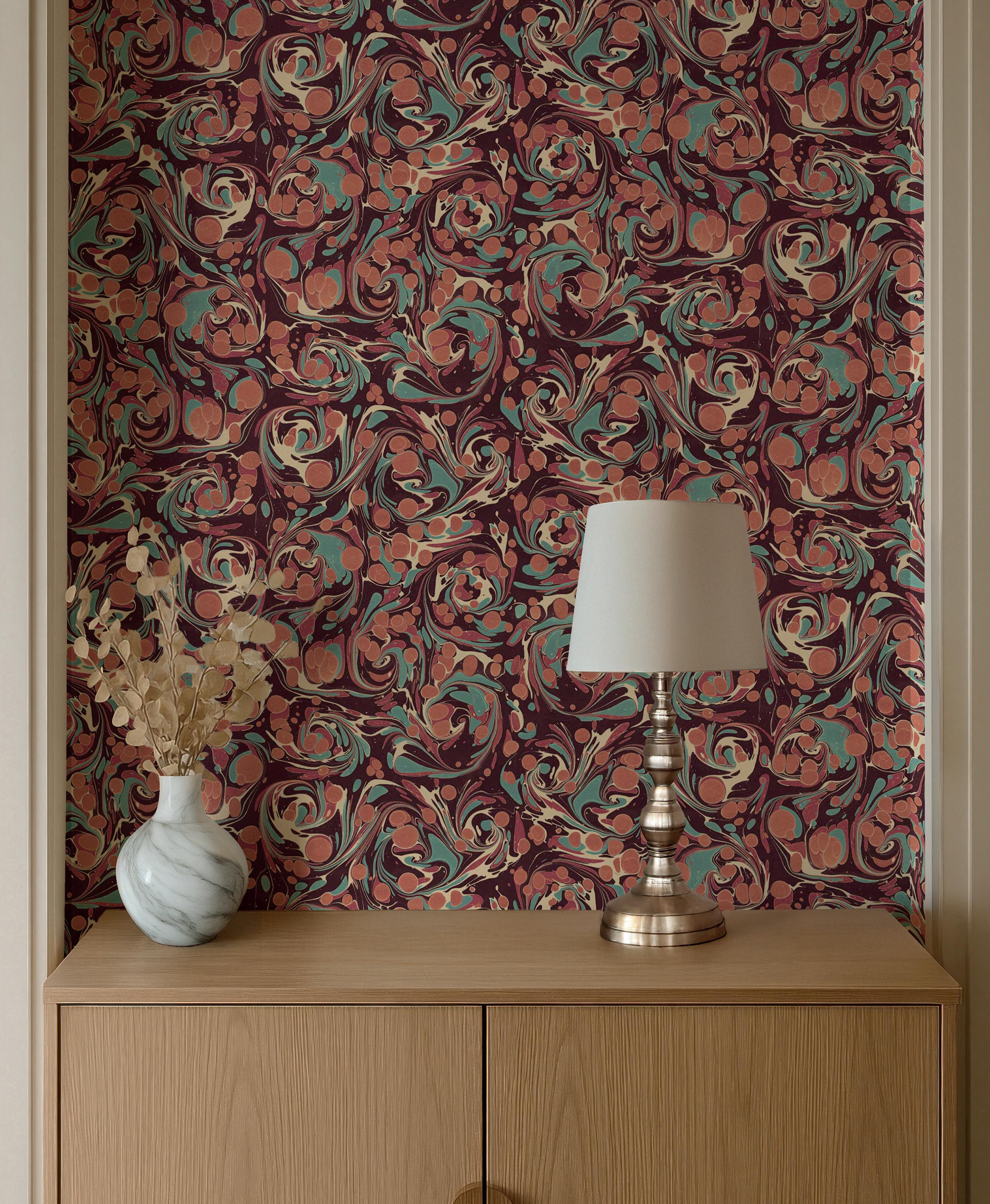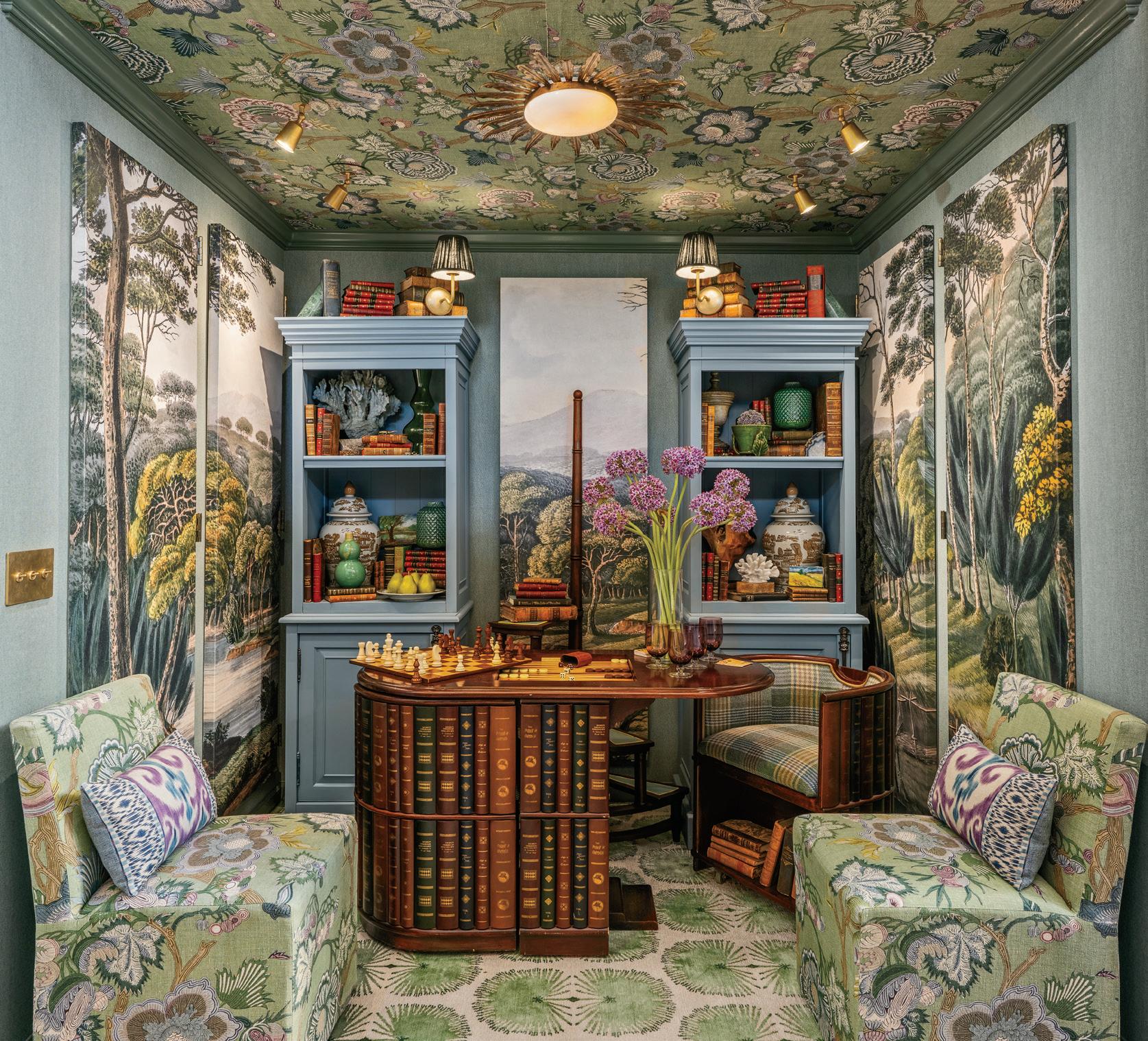 “ I designed a library/game room around a vintage game table that I had recently acquired—it was center stage, with its foldaway design and leather books. The inspiration for my vignette stemmed from the design ethos: Cluttercore/Intentional Clutter. I designed a personal shadowbox of curated collections, collectively displaying meaningful and sentimental items to showcase personal expression and individuality. A nod to one’s own life journey, requiring a sharp eye and keen design! The Indienne Jacobean floral by Thibaut on the ceiling was the ultimate umbrella mimicking the feeling of being in a treehouse. A true sanctuary for a reader or game enthusiast. The gorgeous carpet by Jennifer Manners and the beautiful landscape mural panels on the linen Arte wallpaper, anchored bookcases filled with artfully arranged treasures—a richly textured visual feast!”—Jared Clark, The Clark, Instagram: @curatedbytheclark