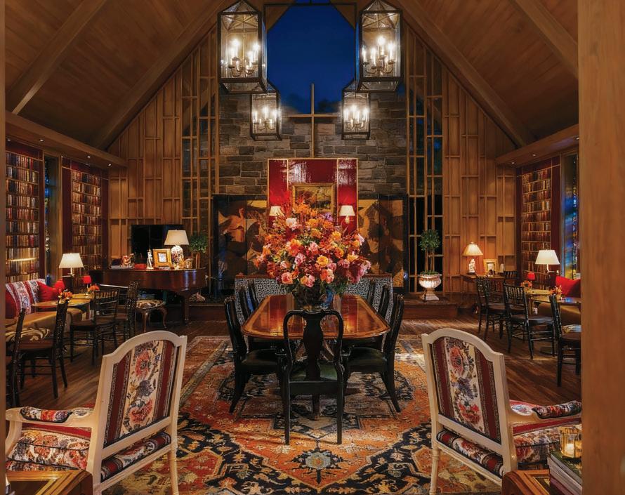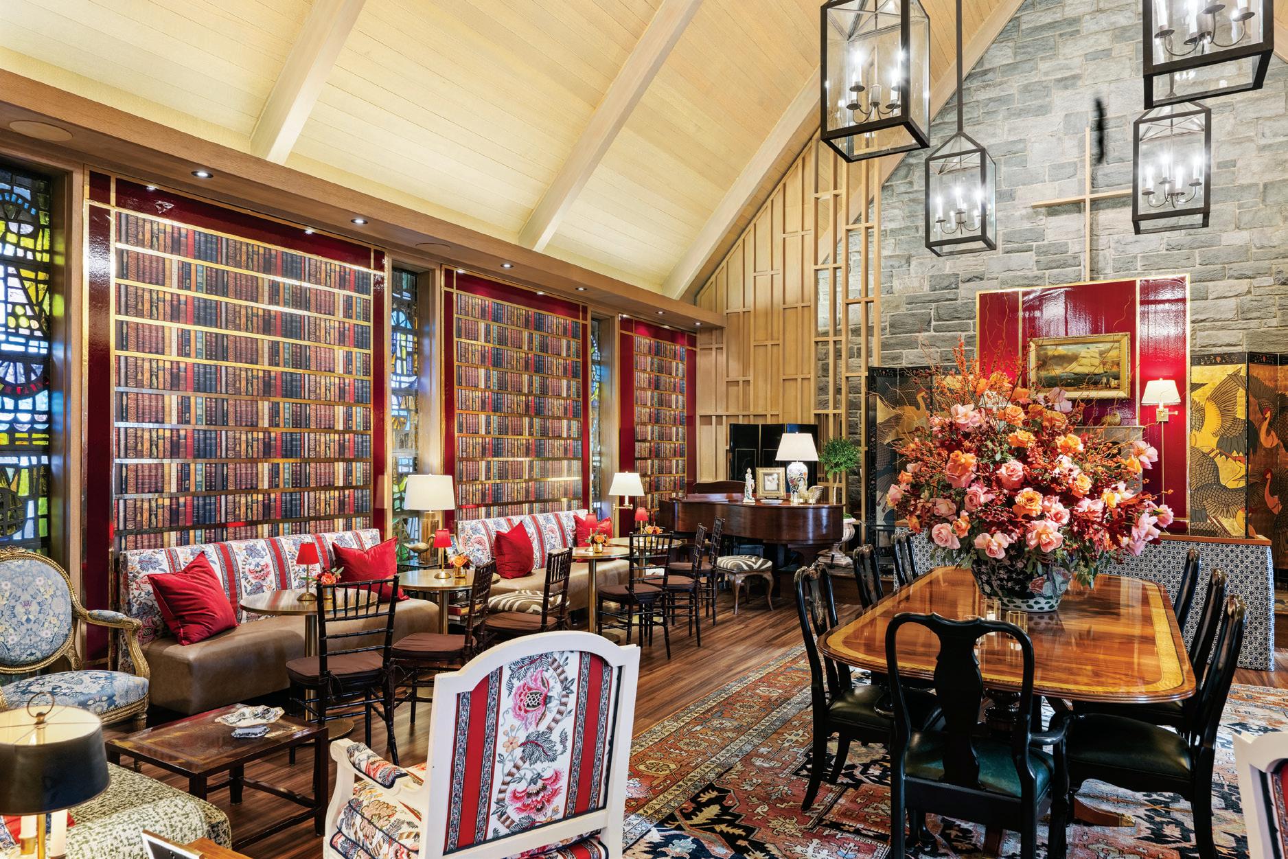 “For this year’s café space and for the thirtieth anniversary of Rooms With a View, we paid tribute to Albert Hadley by converting the chapel of the church into a updated version of the iconic library he designed for Brooke Astor’s Park Avenue apartment. It was a large undertaking that was made possible through the incredible generosity of our trade partners: Brunschwig & Fils, Quadrille, Holly Hunt, Spoonflower, Vaughan Designs and Chesney’s.”—Sydney Frazier, Sydney Frazier Interior Design, sydneyfrazierid.com; Amy Raiter Magnolia; and Victoria Vought, Victoria Vought Designs