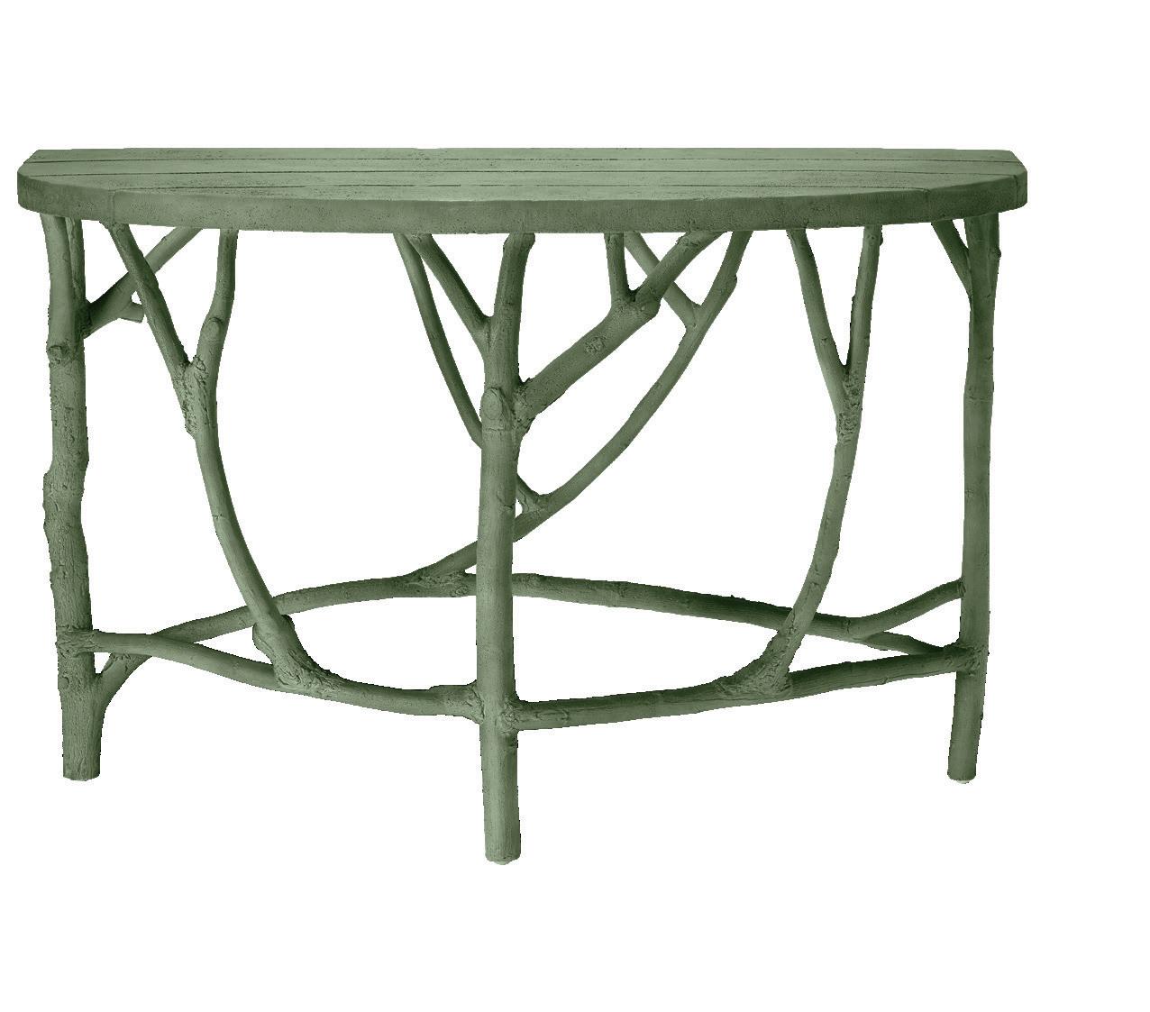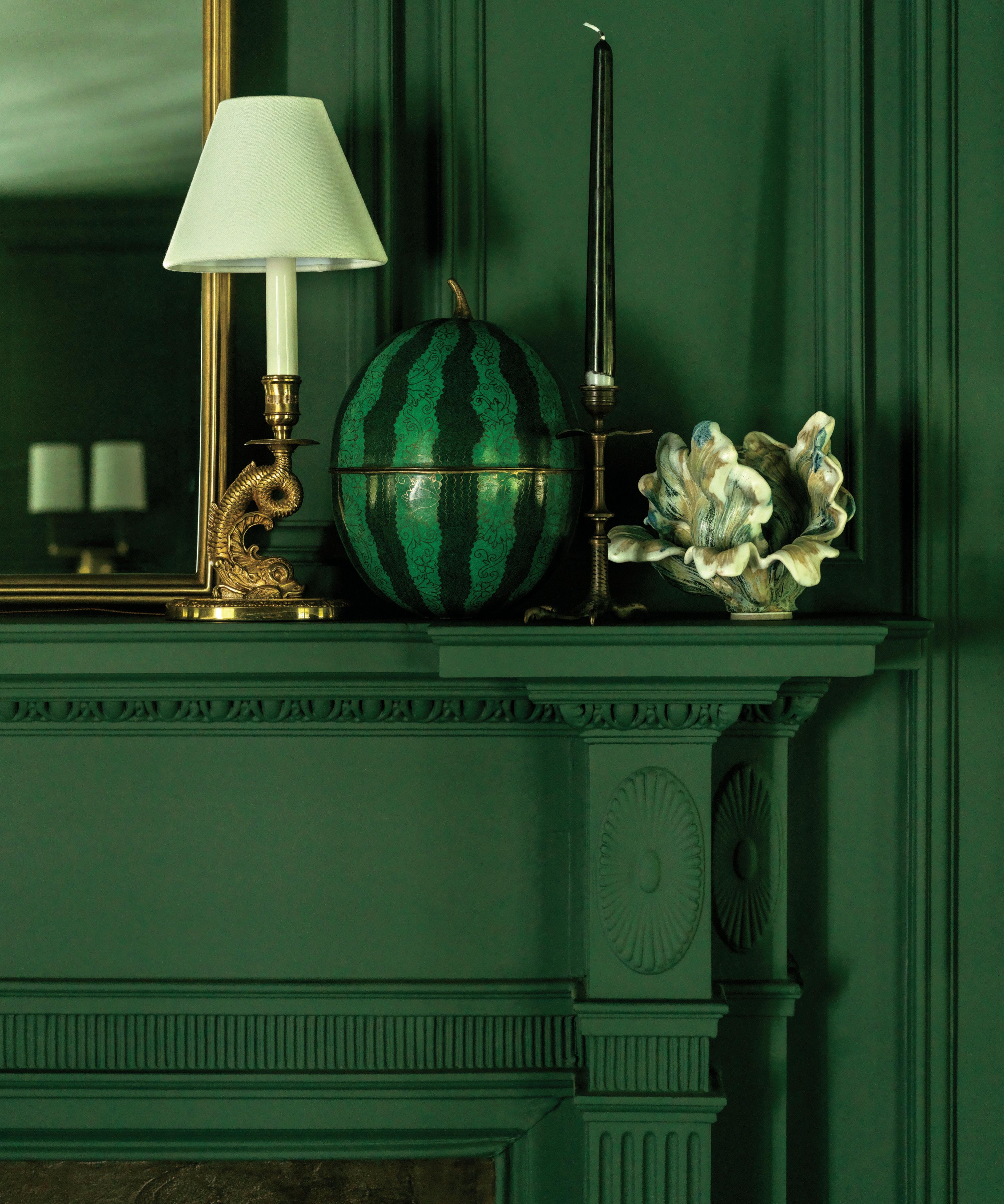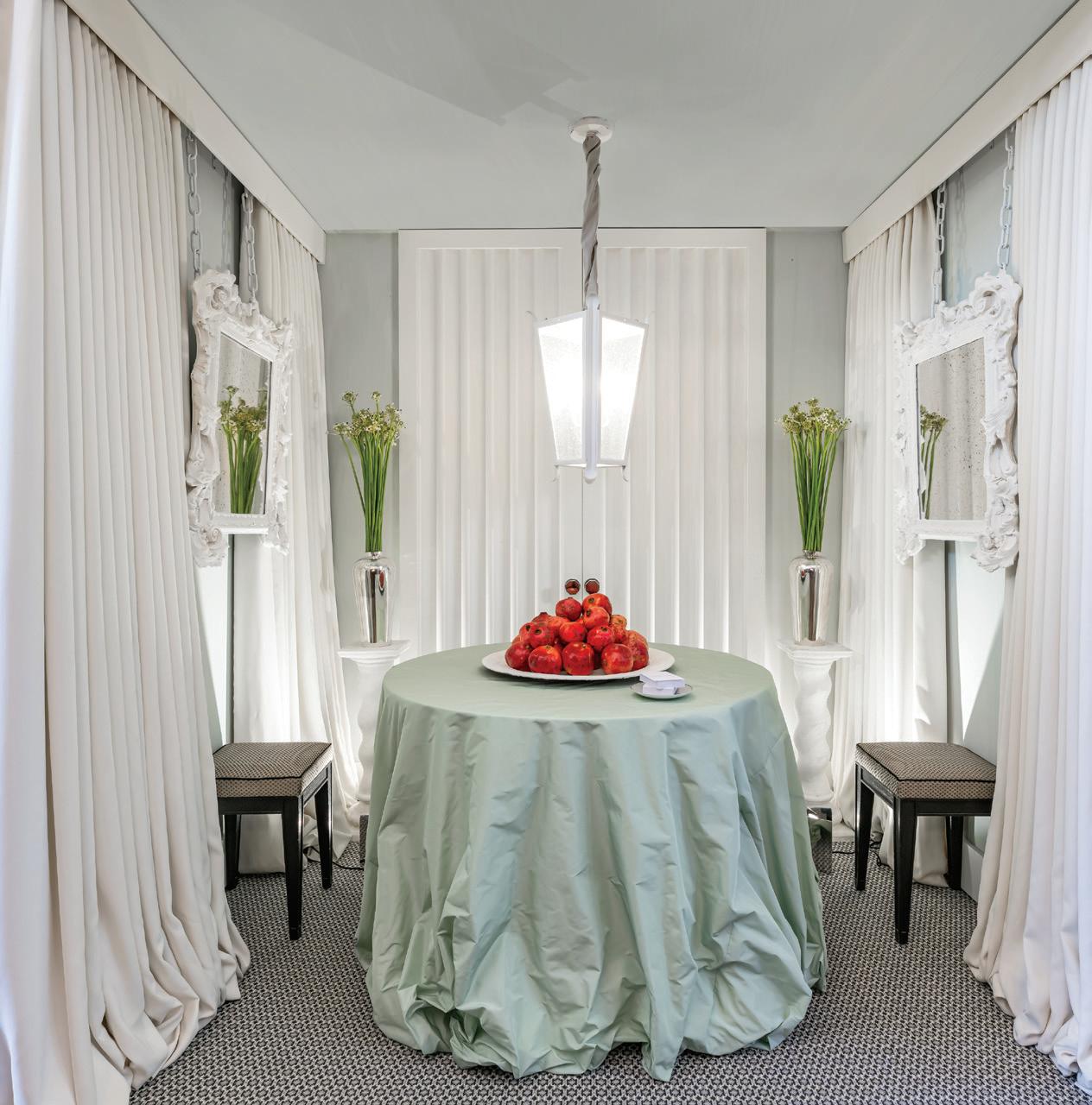 “My design was inspired by a desire to revive a sense of timeless, classic style in tribute to Albert Hadley’s extraordinary taste and his founding of RWAV. The concept for my vignette was to create an entryway setting inside an apartment on Manhattan’s Upper East Side. I wanted it to feel glamorous yet subtle and calming all at the same time. I included a pair of doors that lead into the apartment made out of solid fluted plaster inset into wooden frames with sleek polished chrome octagonal door hardware. Mimicking the fluted doors, I had very simple curtain panels made that fall out of a very clean upholstered valance to keep it modern. The puddling of the curtains also mimics the table skirt, which was inspired by a table skirt that Jackie Kennedy had in her White House. The minty color was inspired by Prada. The wall color plays off of the minty table skirt but also includes a hand-strié finish that gives the space more depth and texture. I had an original 18th-century French mirror that I took to a plaster yard and had them mold it to make the pair and had antique mirror panels set inside of them. As a layering effect, I suspended the plastered mirrors by chain so that they floated in front of the curtain panels. I found the hanging lantern above the center table at a junk store in Queens, spray-painted it white and twisted silk fabric over the chain to add a richness detail. Lastly, to add a pop of strong color, I added a bunch of pomegranates on a tray for the center table.”—Garrett Carter, Garrett Carter Designs, garrettcarterdesigns.com