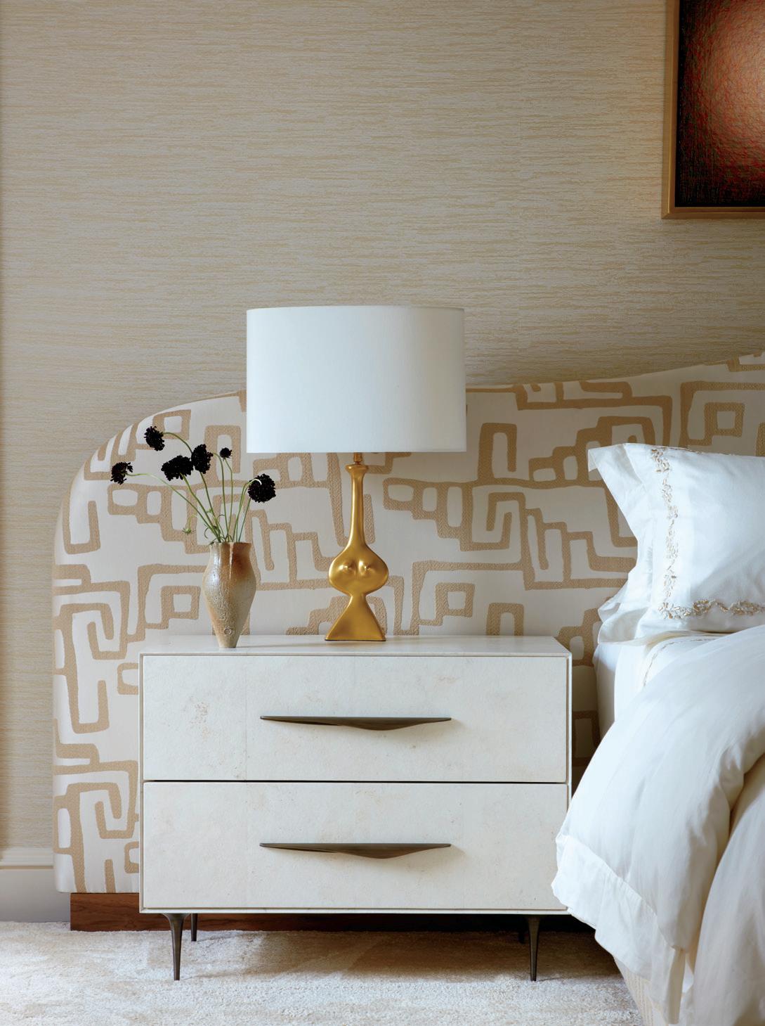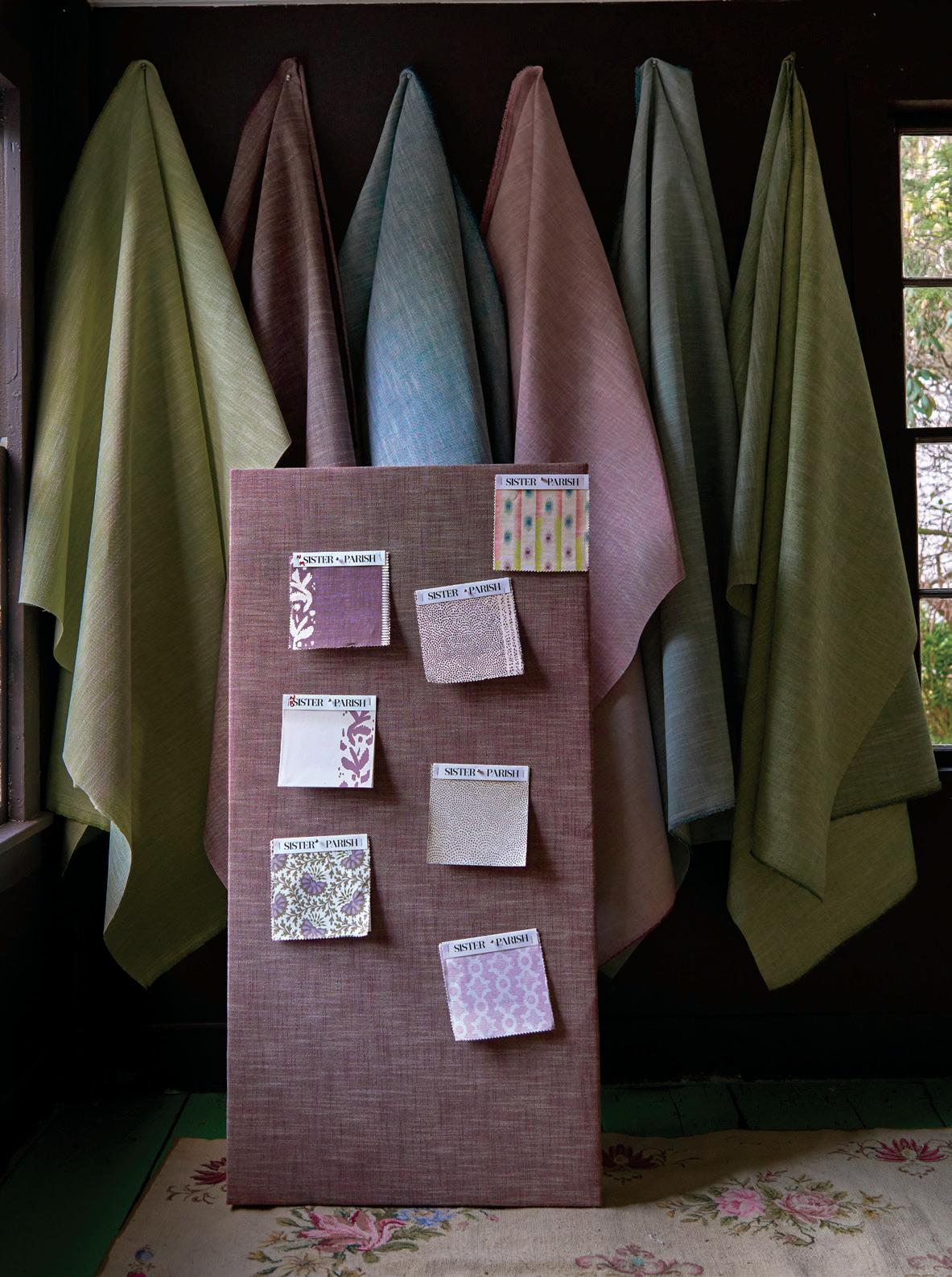 Pattern Plays Resembling an American quilt, Campobello performance fabric (above) pays tribute to Sister Parish’s love for classic American Craft. Breakfast in Bed (top right) is a handprinted wallpaper by Sister Parish Design.