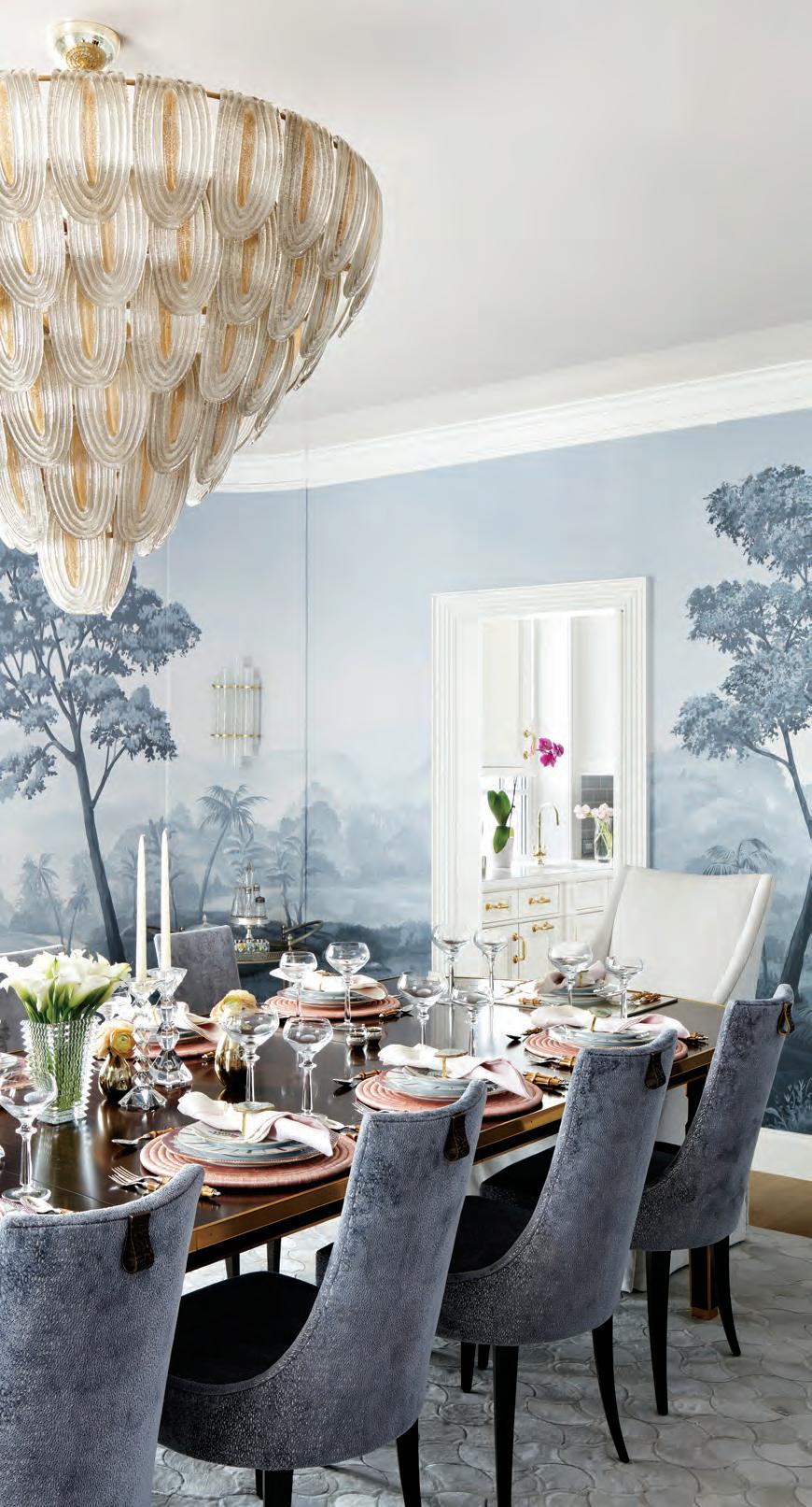 mortar rice vessel, to complement the painting and fill in some of the extra wall space. Another challenge was creating a distinction between living and dining spaces in the open-plan living area, while keeping the spirit of the great room unified. “To address this concern, I designed the custom credenza placed in the center to bridge the two parts of the room, yet separate them,” Weiss says. She also installed a dramatic pendant over the credenza, while connecting and enlivening the two parts of the room with a sculptural grace note.