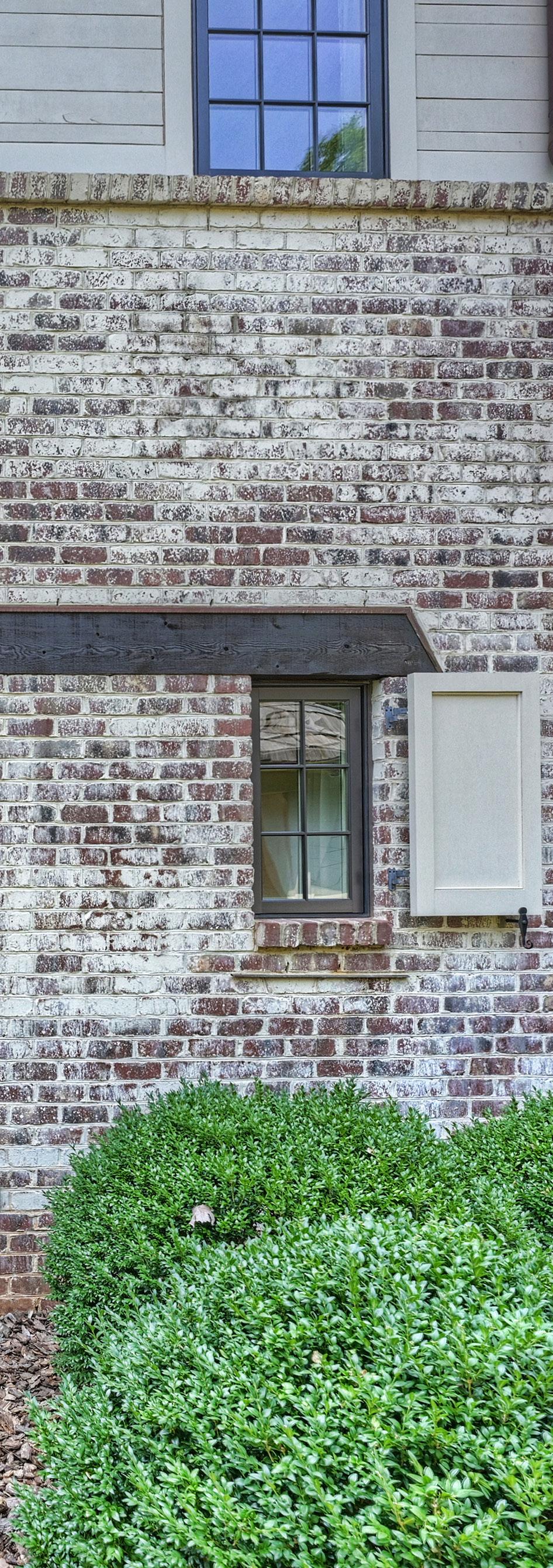 • Gorgeous lime washed brick exterior with cedar shake roof.