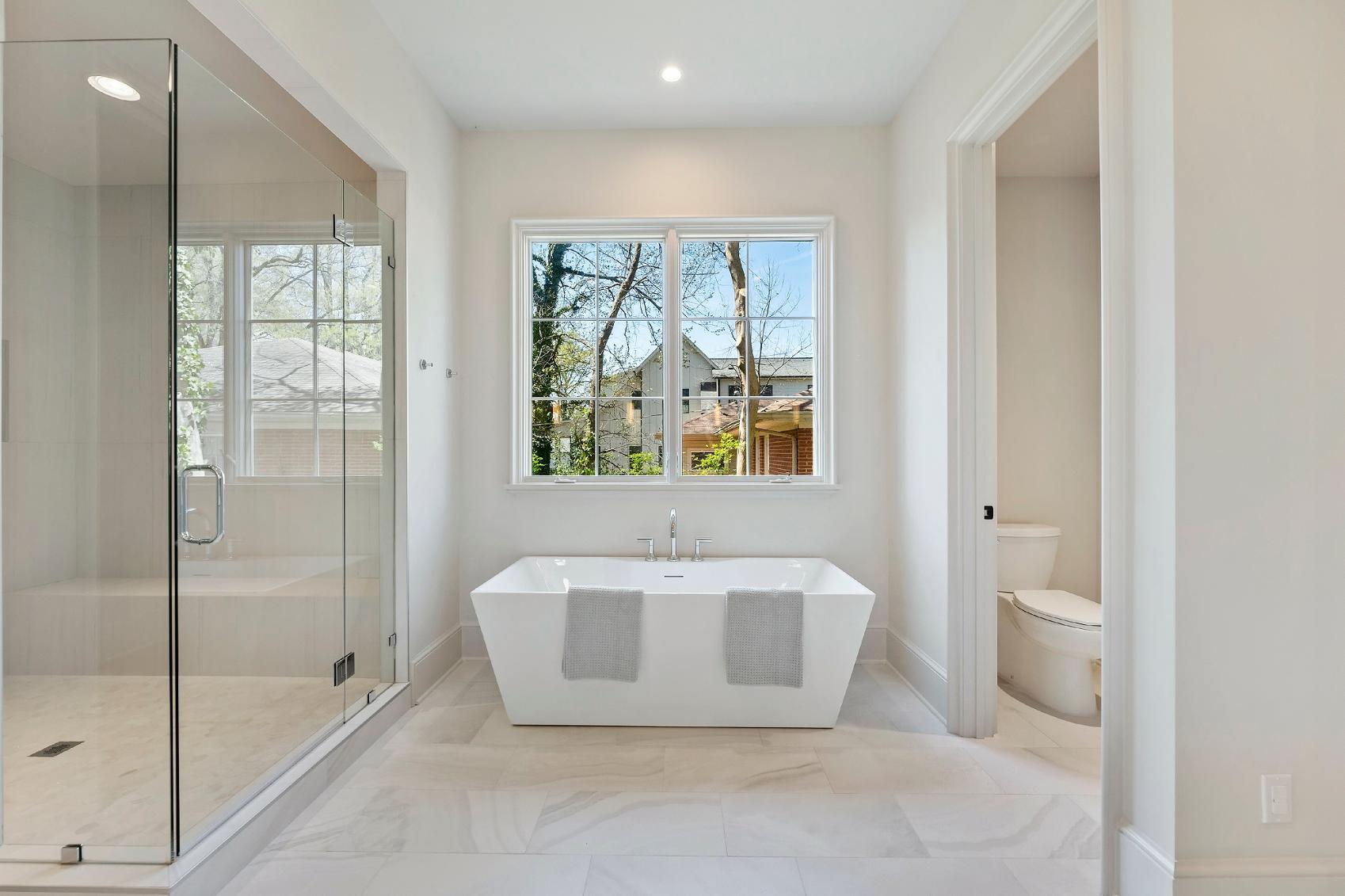 - dual vanitiessoakingtub + oversized framelessglass walk-in shower