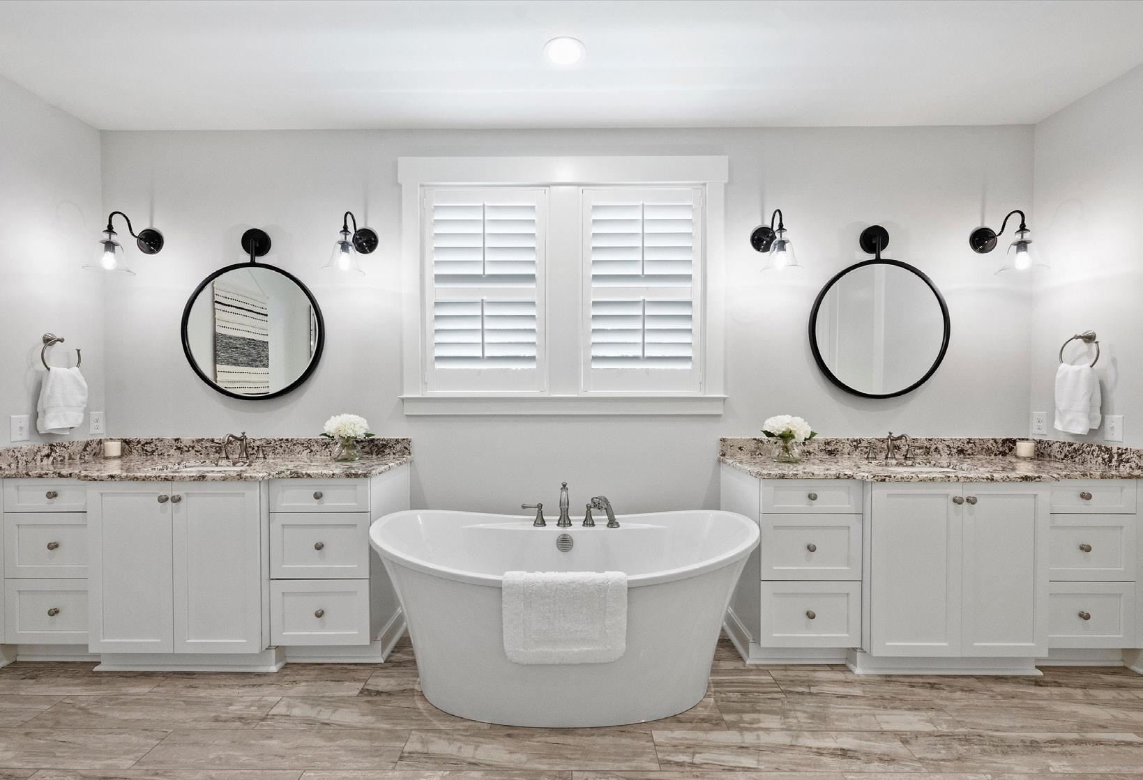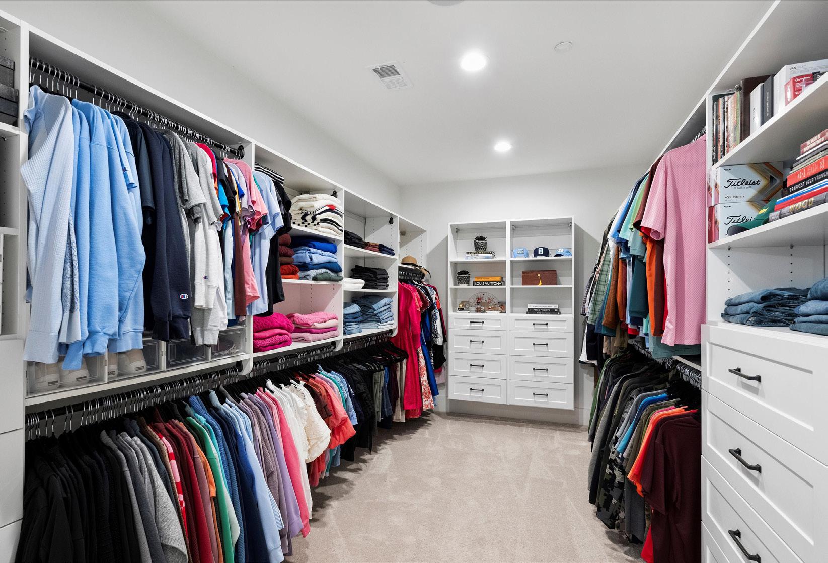 Main level primary suite with spa-like bath including free standing tub, walk in shower, dual vanities, water closet and spacious custom closet with room for absolutely everything
