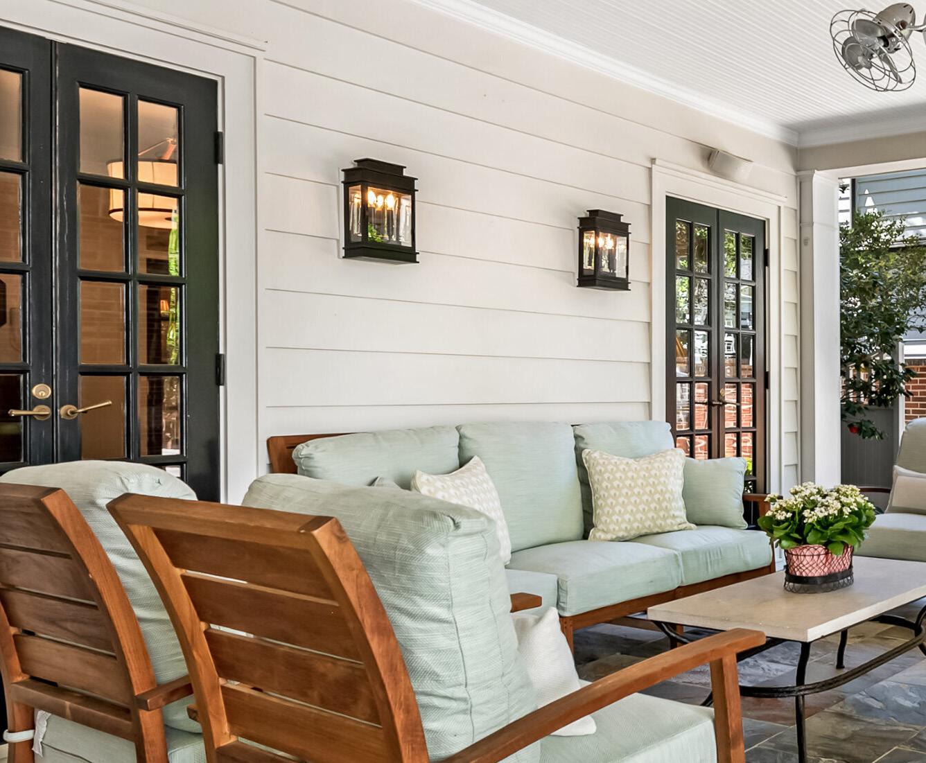 • Brick paved path leads to rockingchair front porch with stately columns, wooden plank floors and coach lighting