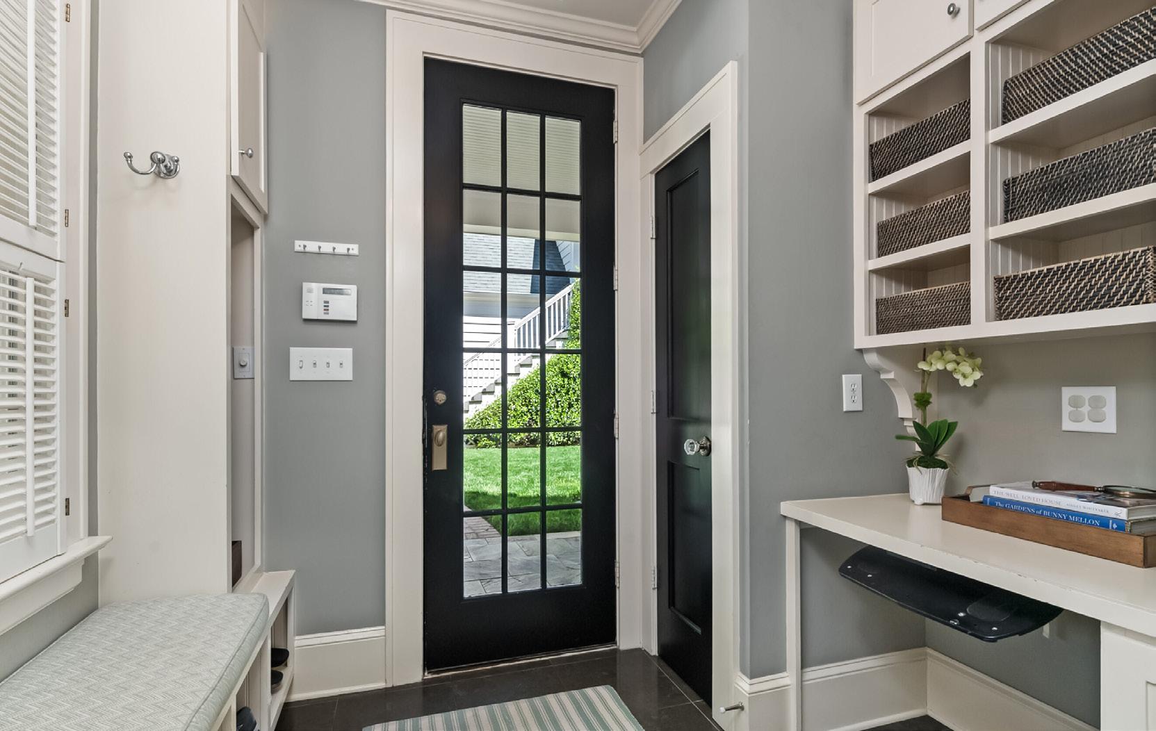 • Vestibule entry with built-in shelving, storage closet, and glass light fixture