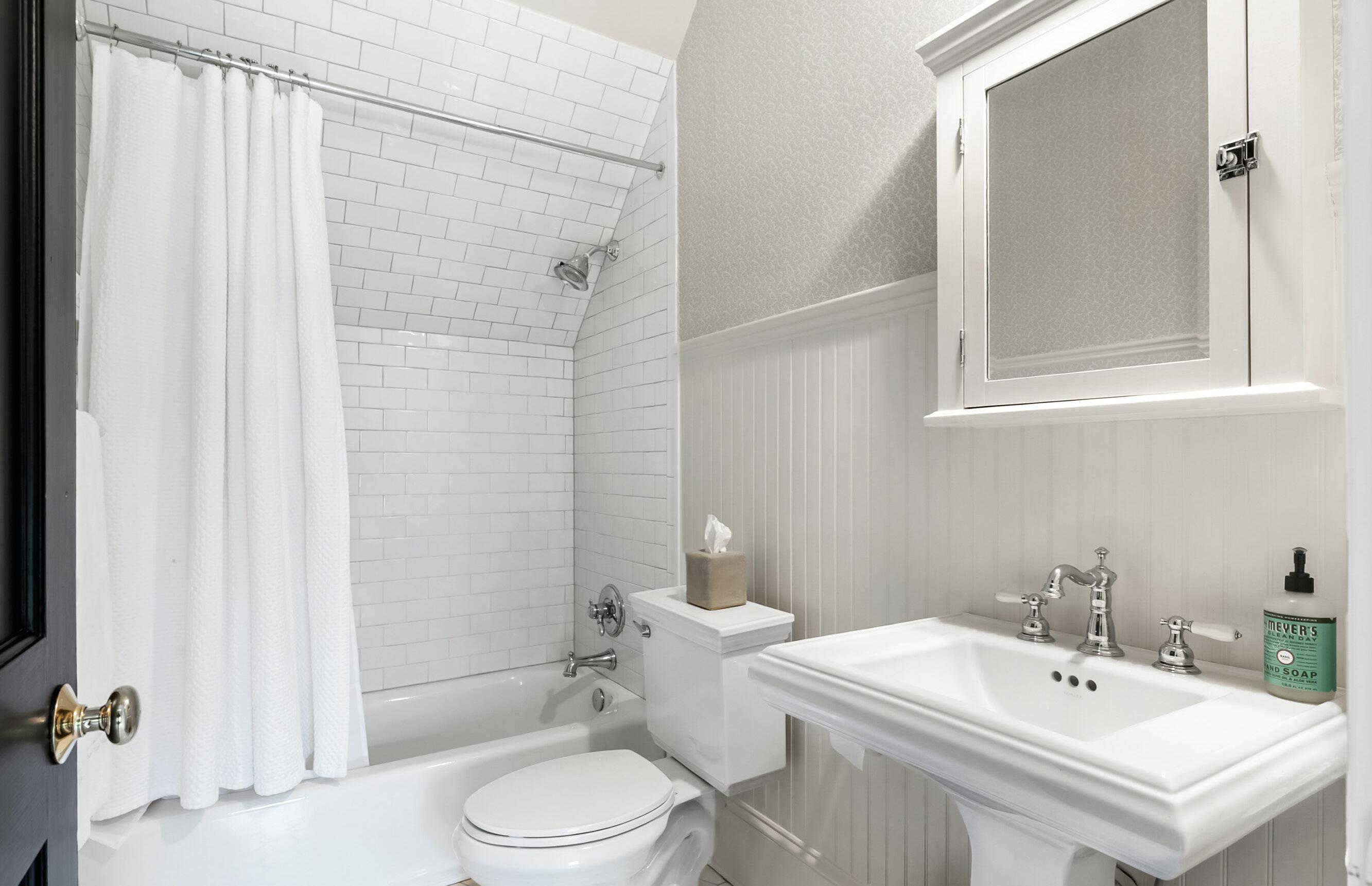 • Full bath with white tile flooring, painted beadboard wall detail, pedestal sink, medicine cabinet and bathtub/shower combination with white subway tile surround