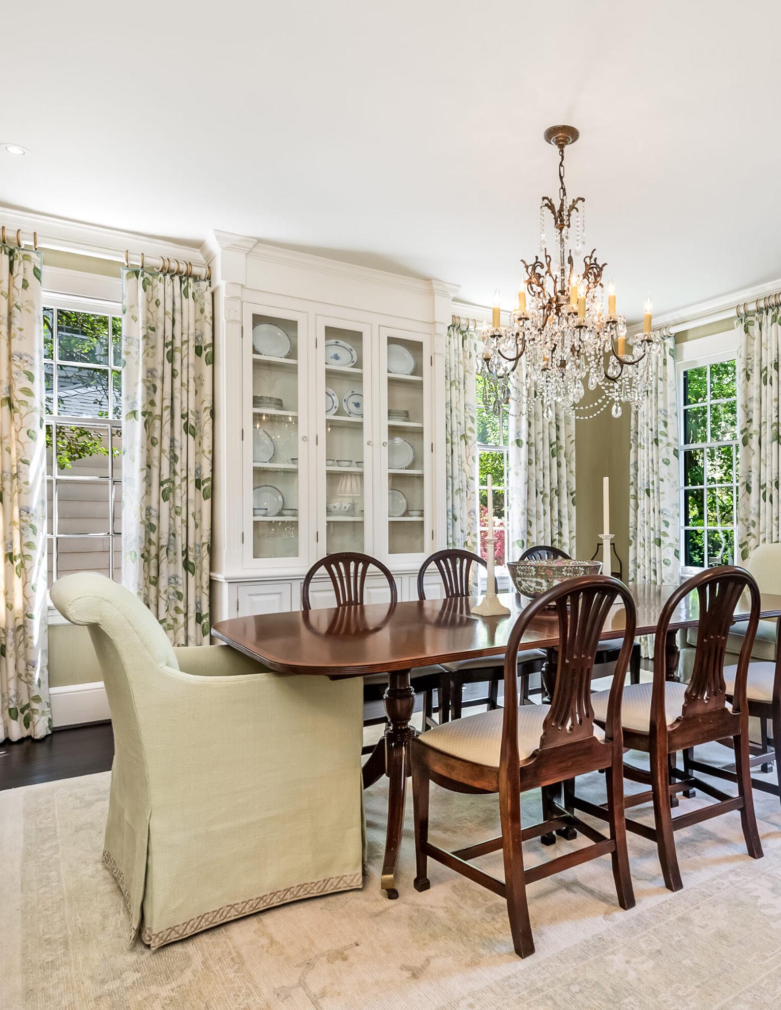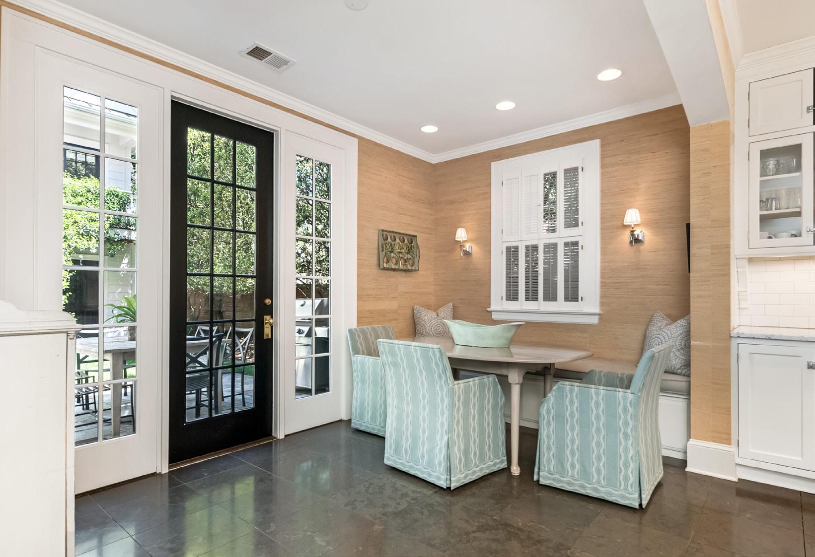 • Breakfast area with grasscloth wallpaper, sconce lighting, and built-in dining banquet