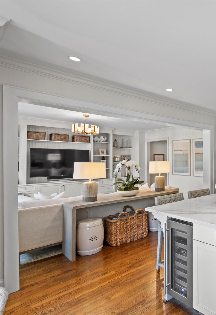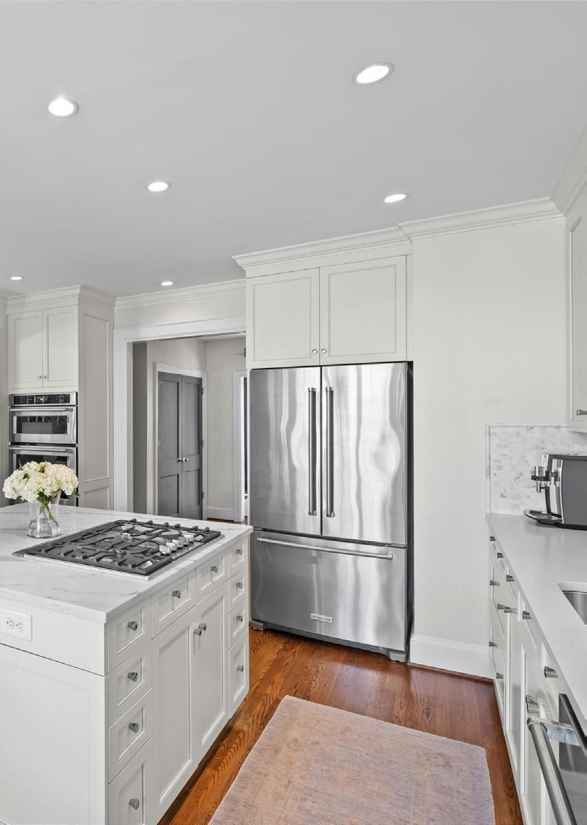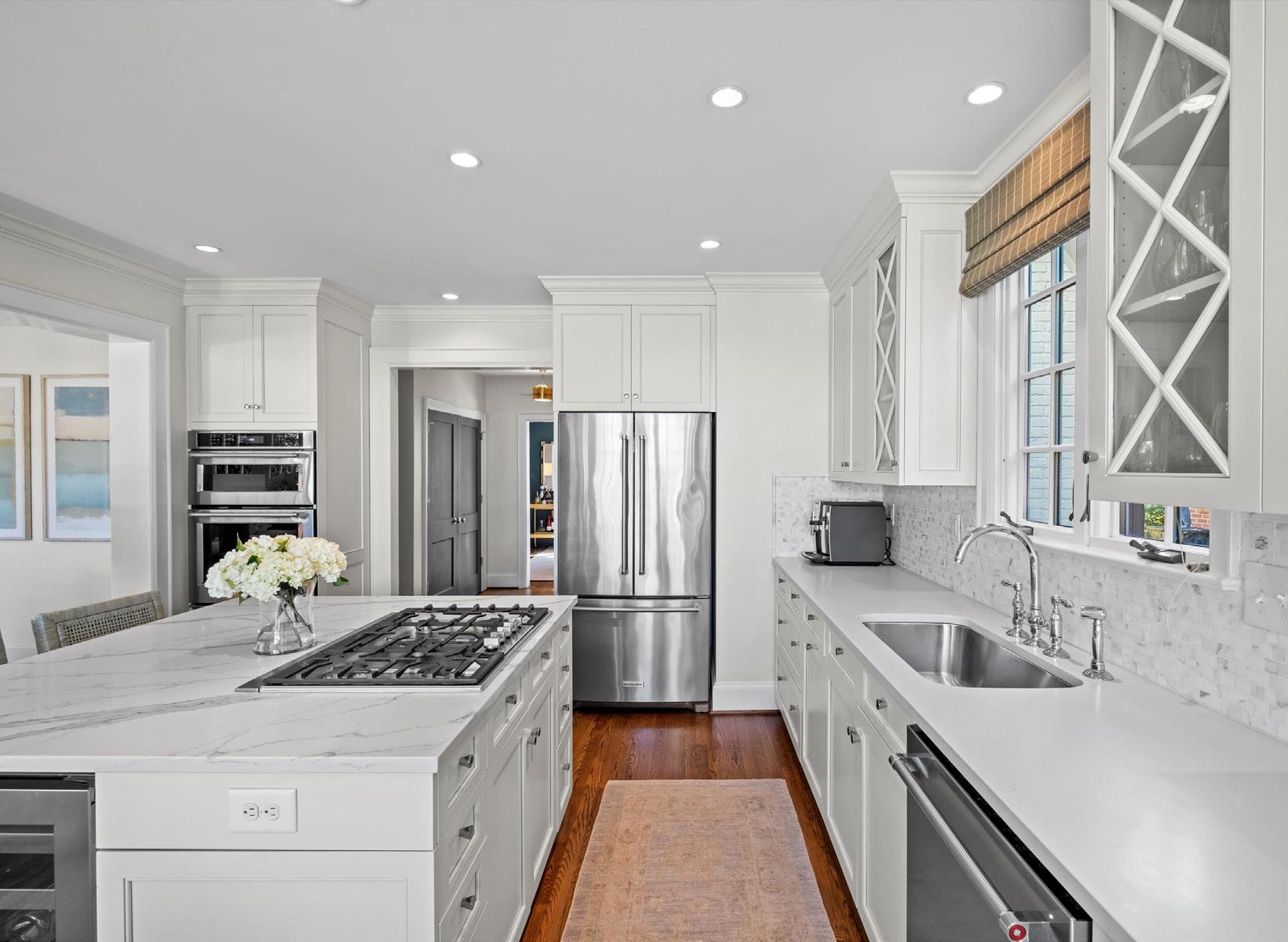 • Gourmet kitchen features custom white shaker cabinetry, white quartz countertops with marble backsplash, island with barstool seating, and all newer stainless appliances (Thermador gas range, KitchenAid dishwasher, KitchenAid wall oven and microwave, and wine fridge)