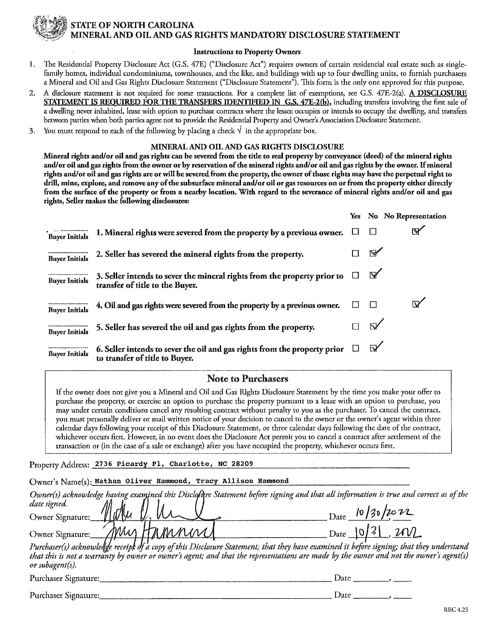 1. e Residential Property Disclosure Act (G.S. 47E) (“Disclosure Act”) requires owners of residential real estate (single-family homes, individual condominiums, townhouses, and the like, and buildings with up to four dwelling units) to furnish buyers a Residential Property and Owners’ Association Disclosure Statement (“Disclosure Statement”). is form is the only one approved for this purpose. A disclosure statement must be furnished in connection with the sale, exchange, option, and sale under a lease with option to purchase where the tenant does not occupy or intend to occupy the dwelling. A disclosure statement is not required for some transactions, including the first sale of a dwelling which has never been inhabited and transactions of residential property made pursuant to a lease with option to purchase where the lessee occupies or intends to occupy the dwelling. For a complete list of exemptions, see G.S. 47E-2.