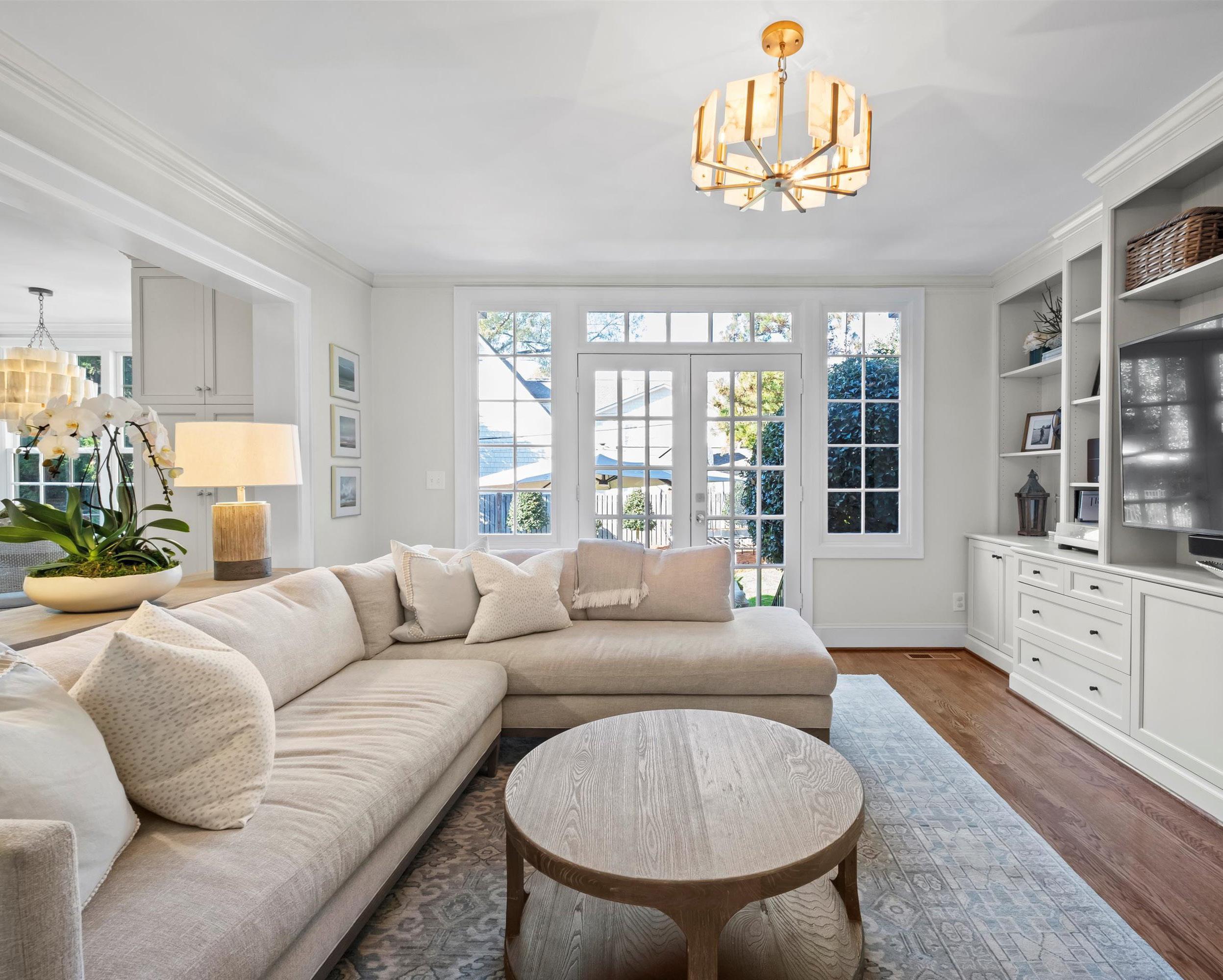 • Spacious family room with custom built-ins, modern chandelier and glass French doors leading to the rear patio