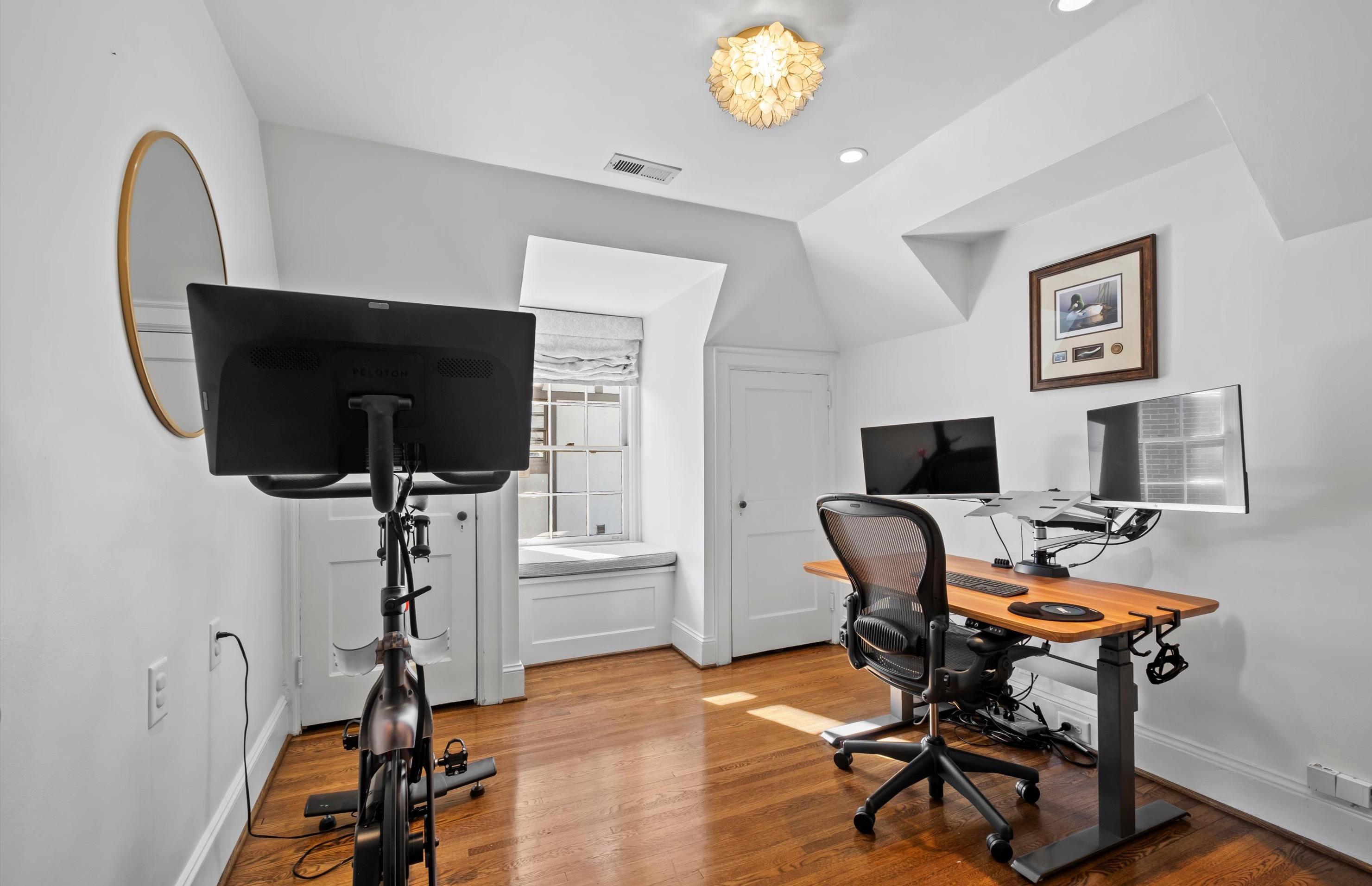 • Primary suite features a large bedroom with plantation shutters, sitting area/computer nook, walk-in closet with custom storage system, and spa-like bathroom