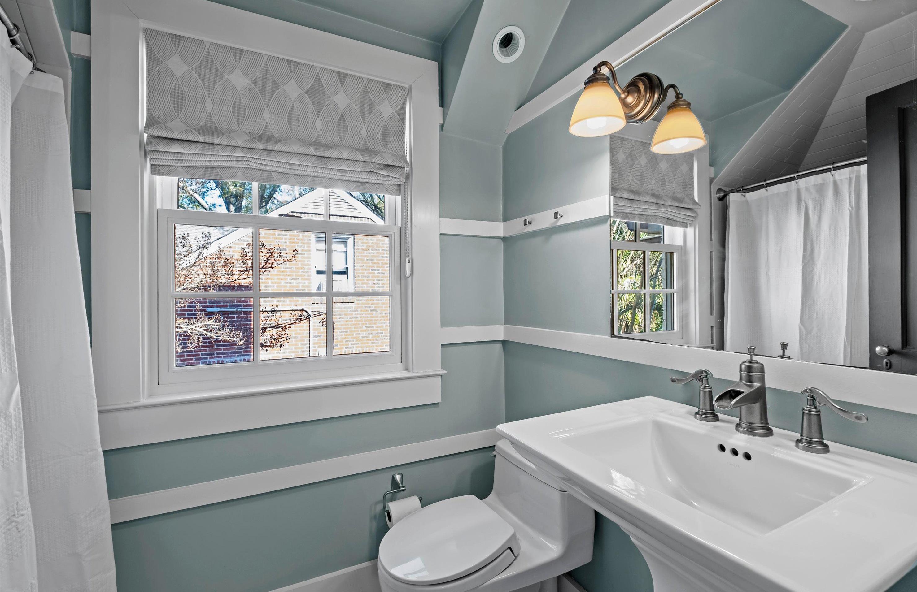 • Full hall bathroom features white penny tile flooring, pedestal sink and bathtub/shower combination