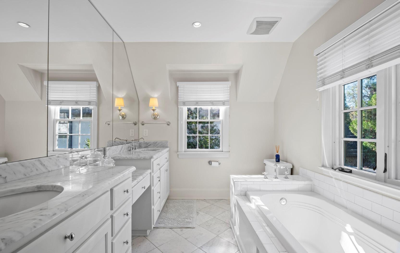 • Primary bathroom features white marble flooring, dual vanity with white marble countertops and built-in vanity, shower with frameless glass door, garden tub and linen closet
