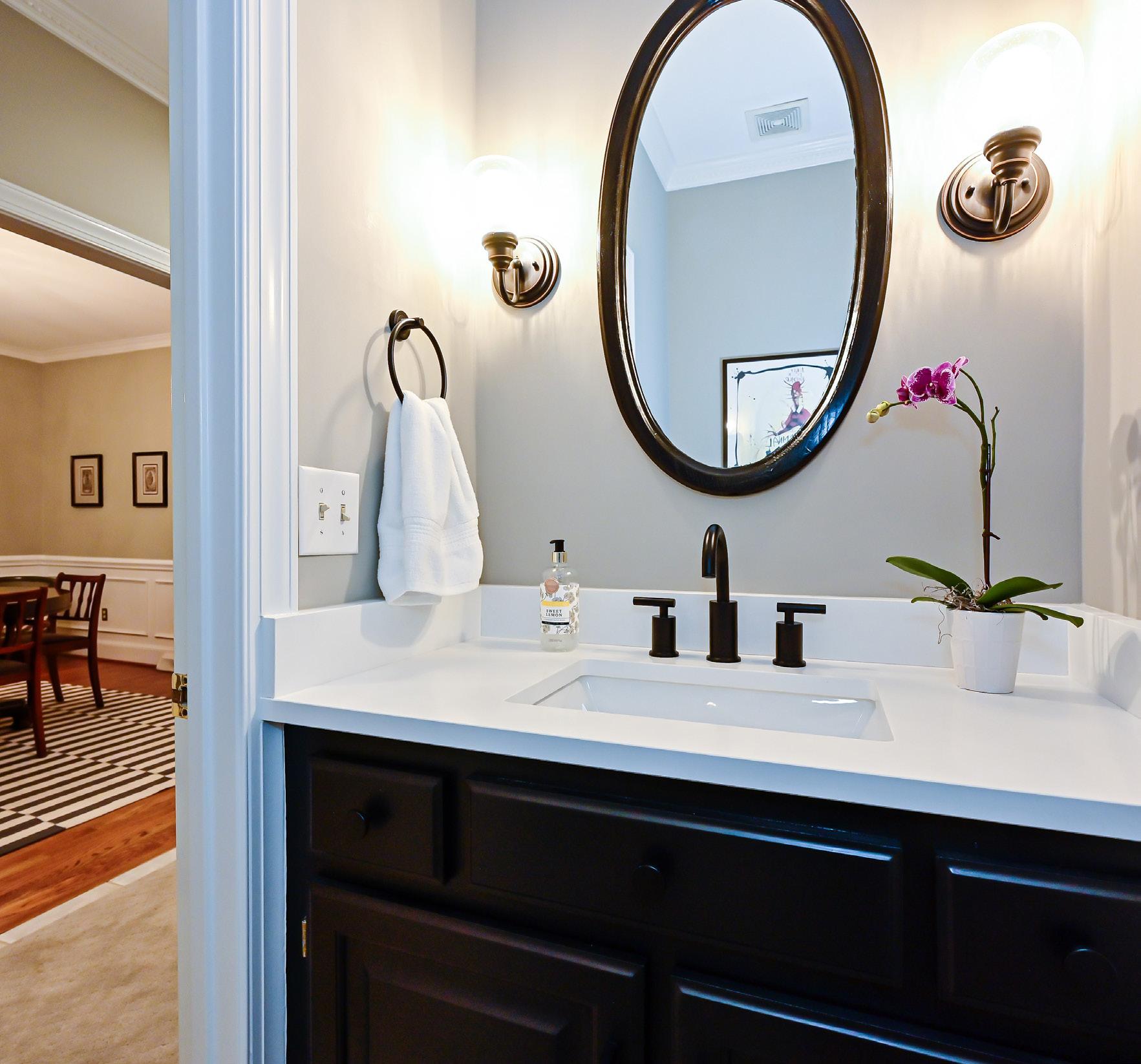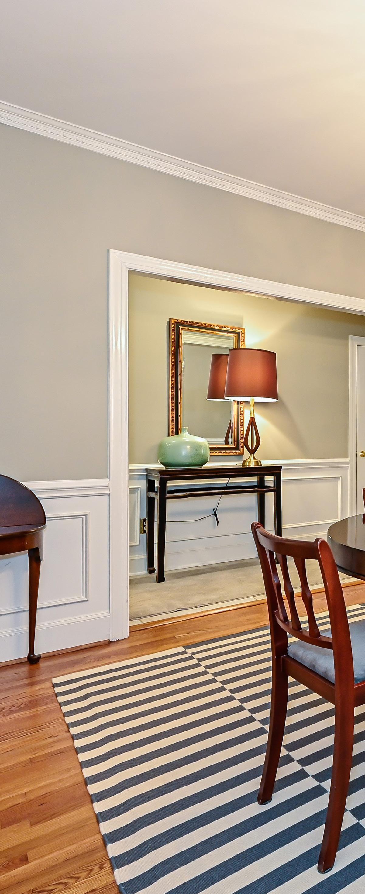 Adjacent to the great room is the stately dining room with a lovely chandelier, crown molding and chair rail with wainscotting below. This is the perfect setting for formal dining. There is ease of access to the kitchen.