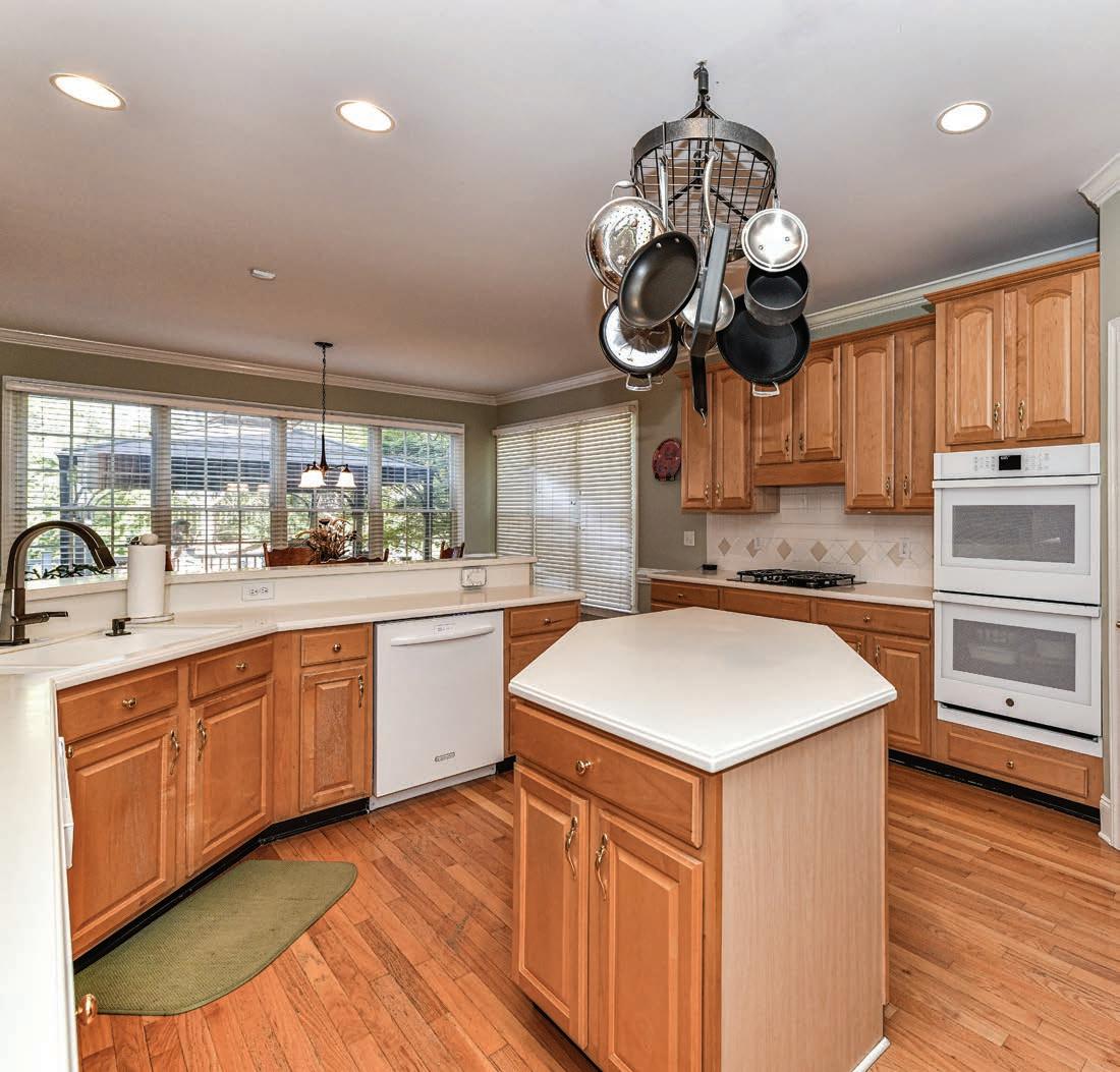 • Large kitchen with 42” maple cabinetry, island, solid surface countertops, tile backsplash, gas cooktop, new faucet, 2 dishwashers, and double GE ovens (2024). Large pantry. Breakfast area overlooks backyard.