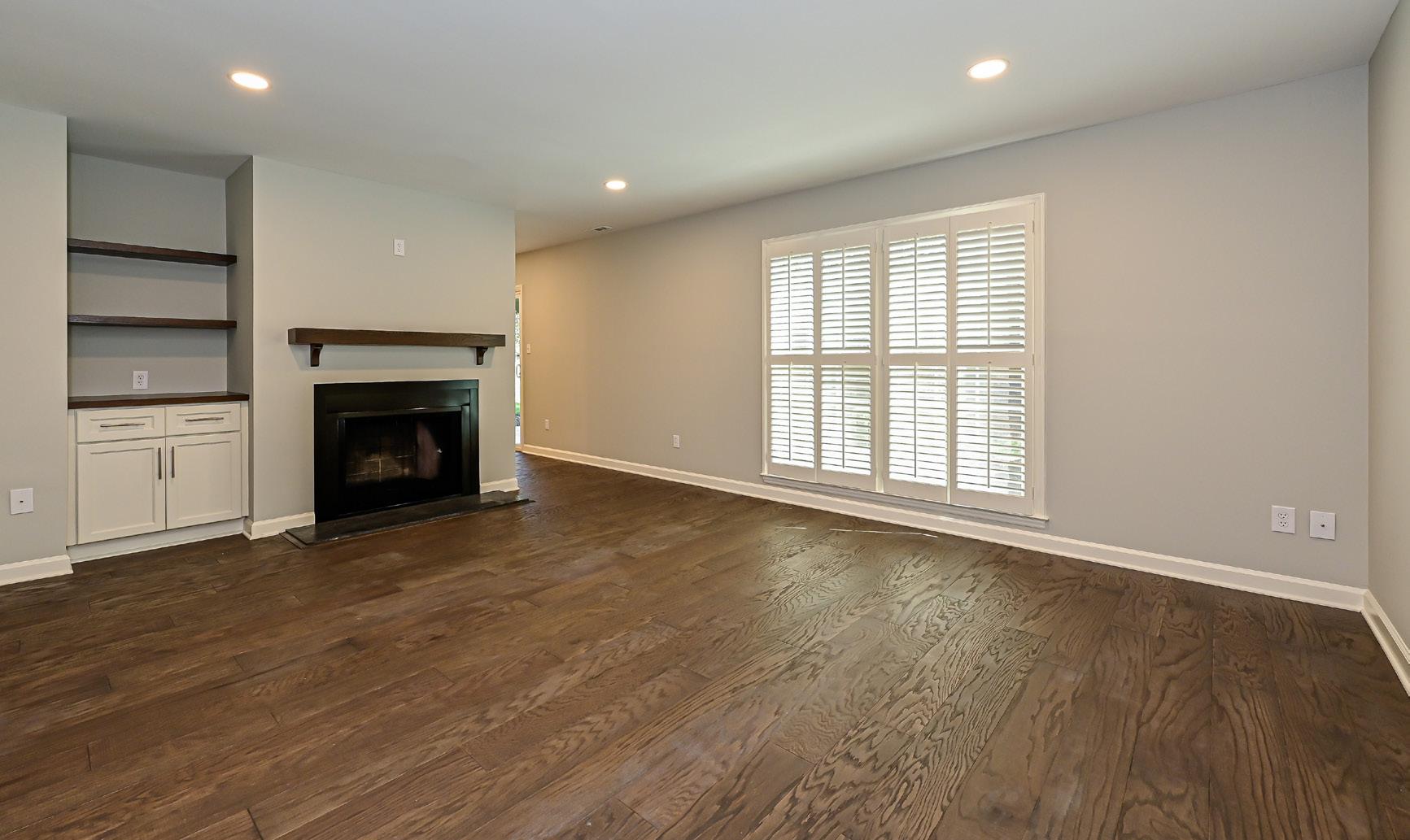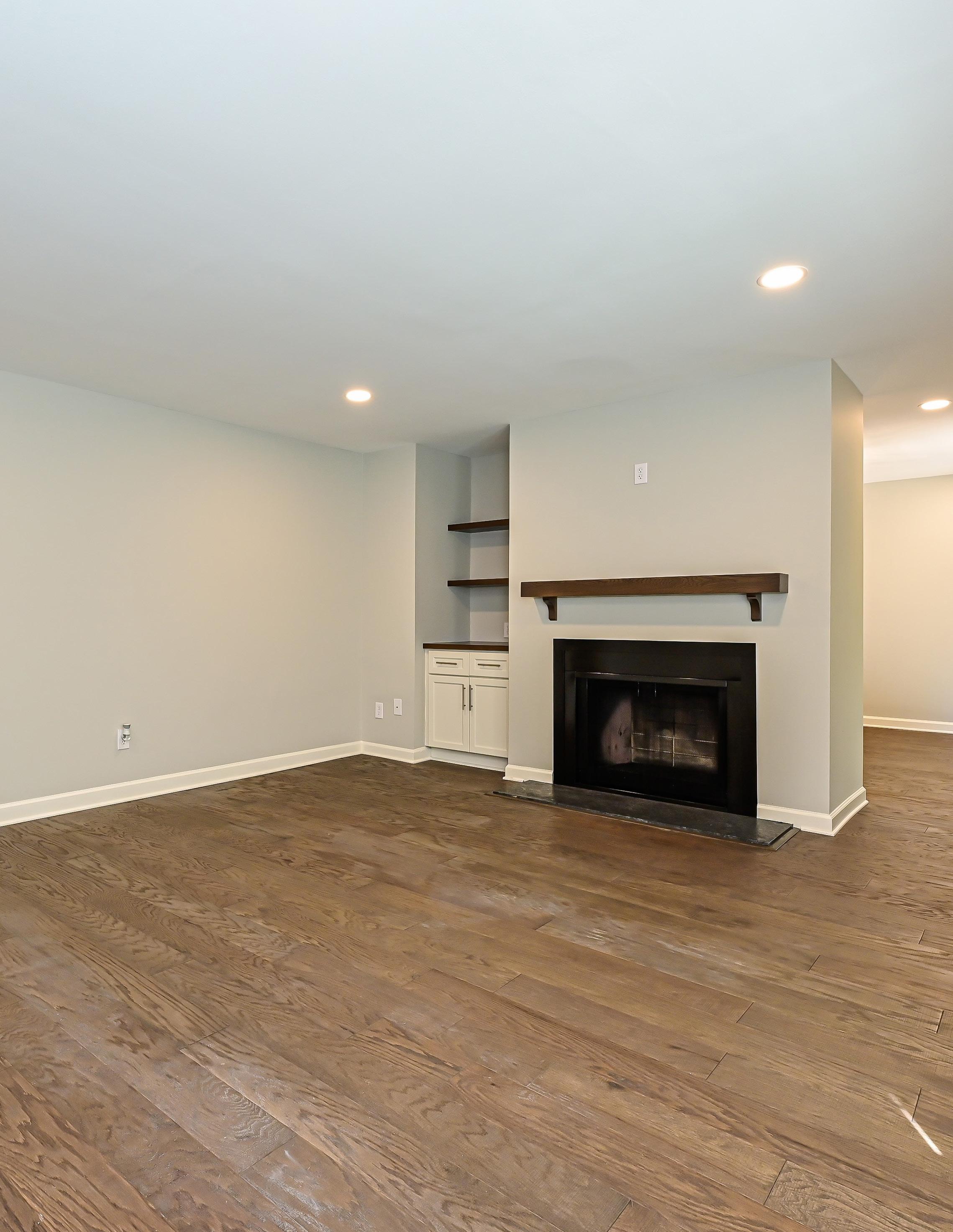 Straight ahead is the spacious, light filled, living room with wood flooring, recessed lighting, double windows with plantation shutters, a wood burning fireplace with mantel above and a custom built-in, with cabinet and drawer storage and wood shelving above.