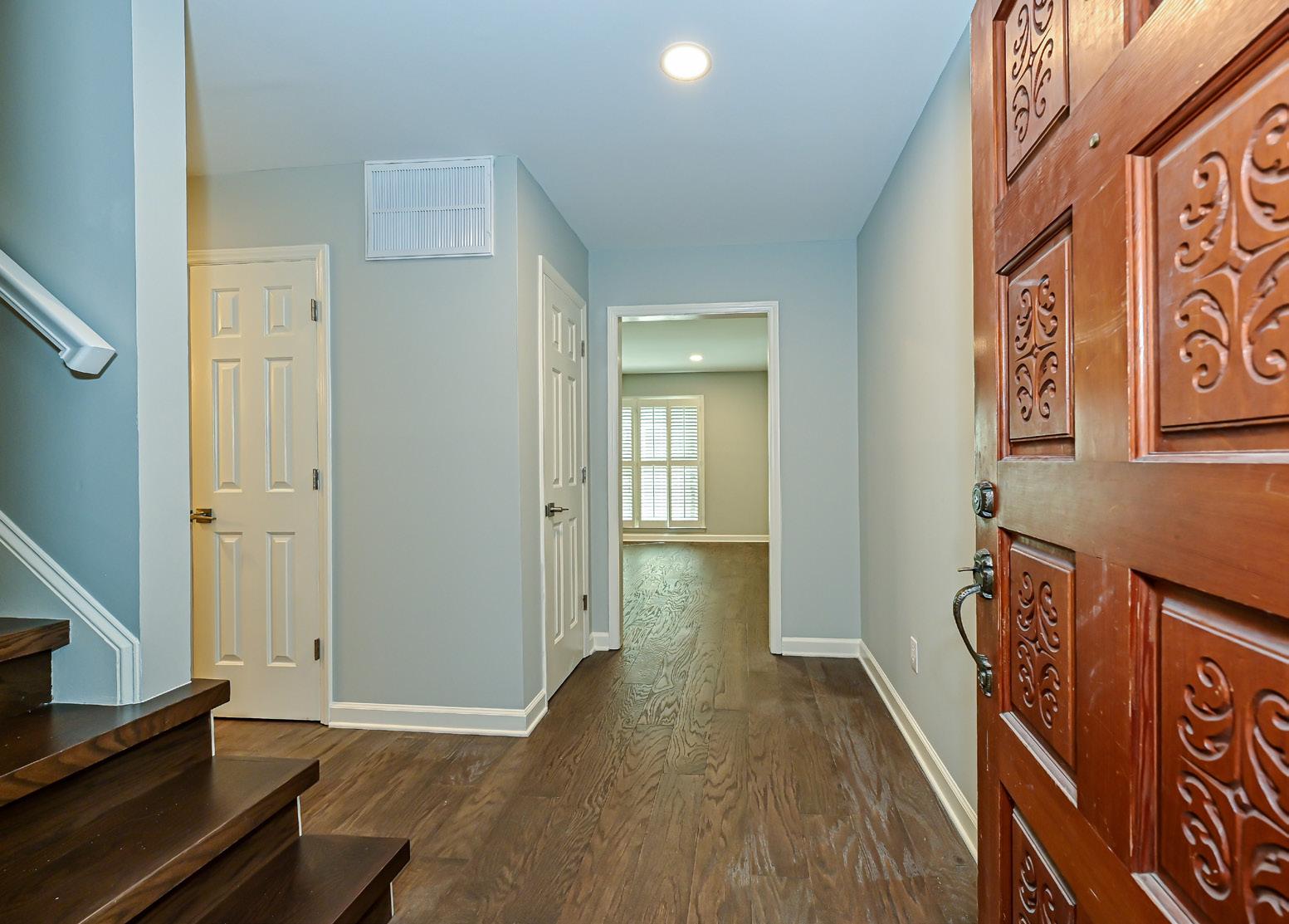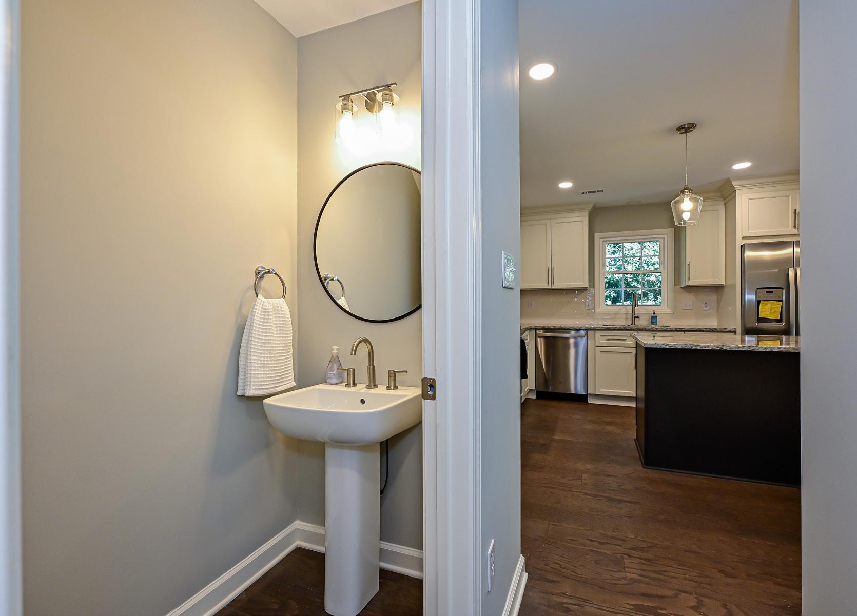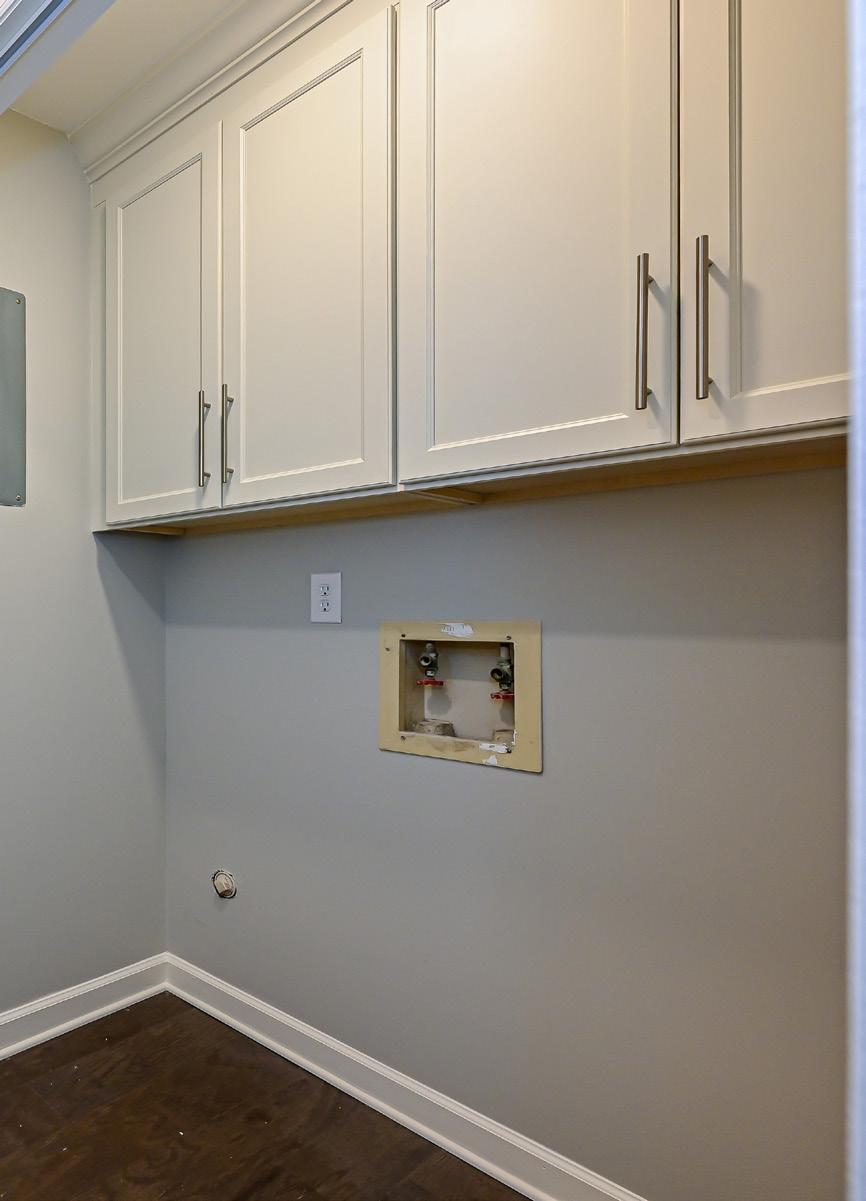 The powder room, located in the hallway has a pedestal sink, wood flooring and a mirror with vanity lighting above. The laundry is located across from the powder room and features a back wall of cabinets with soft close doors.